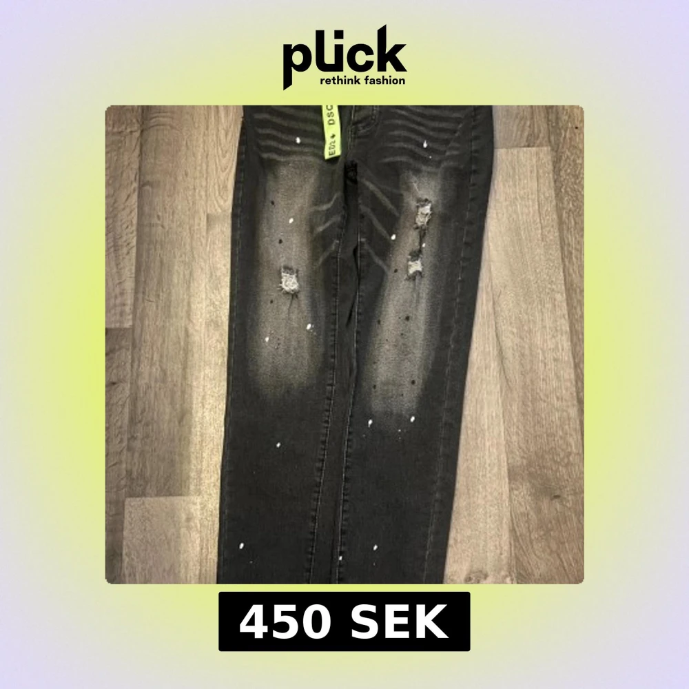 Svarta jeans med skinny passform, coola slitningar och färgstänk på benen. De har en tvättad look med ljusare partier och ribbade detaljer ovanför knäna. Materialet är klassisk jeans och de har en modern streetstil som sticker ut.