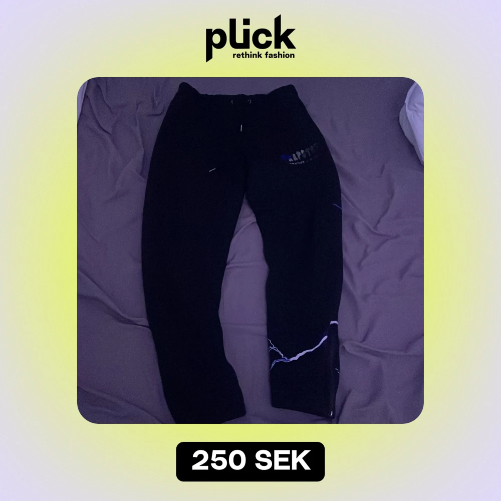 Säljer ett par svarta mjukisbyxor från Trapstar med ett coolt blixtmönster i vitt och blått längs ena benet. Byxorna har en bekväm passform och är perfekta för chill dagar. De har även en elastisk midja med snörning för bästa komfort. Perfekta för både vardag och avslappnade tillfällen!