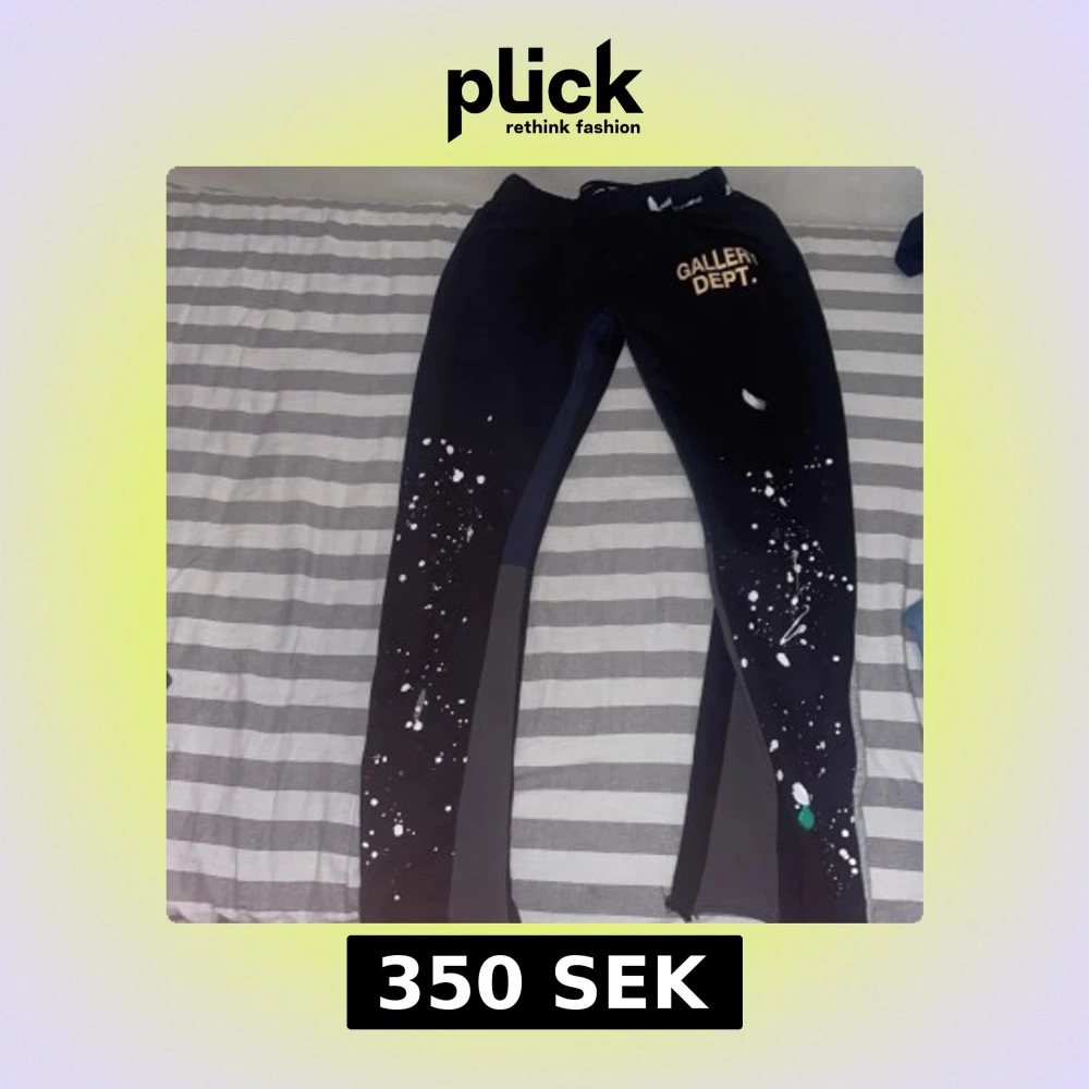 Svarta mjukisbyxor från Gallery Dept. med tryckt logga på höften och unika färgstänk i vitt och grönt längs benen. Byxorna har elastisk midja och inslag av mörkgrå paneler på sidorna. Perfekt för dig som gillar streetwear med konstnärlig vibe.