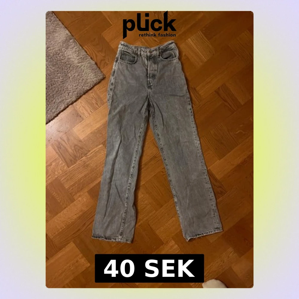 Säljer ett par gråa jeans med snygg tvätt och raka, breda ben. Modellen har hög midja och klassisk knappgylf med flera silverfärgade knappar. Jeansen har fem fickor och bälteshällor, perfekta för en chill och trendig look.