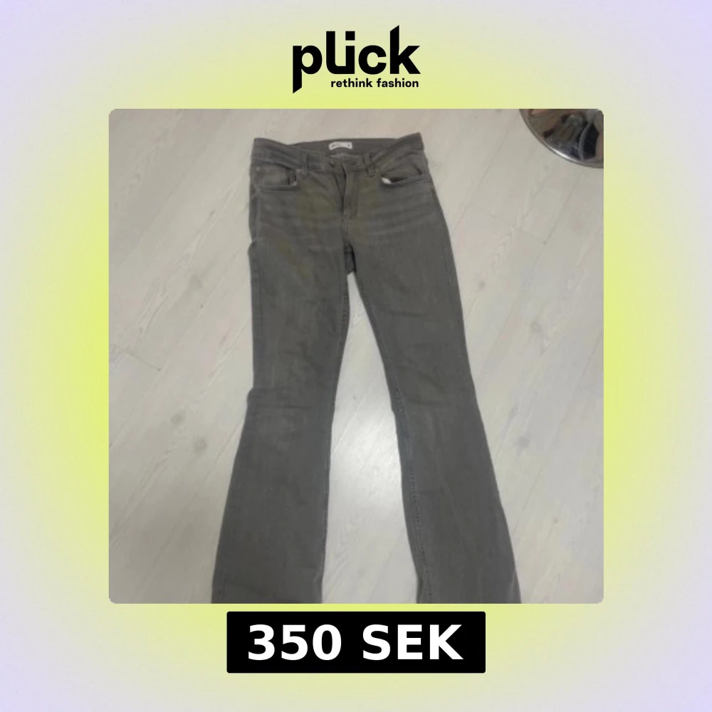 Säljer ett par gråa jeans med bootcut-modell. Jeansen har klassisk femficksdesign och är tillverkade i ett mjukt denimtyg. Perfekta för dig som gillar en lite vidare passform nertill och vill ha en stilren look.