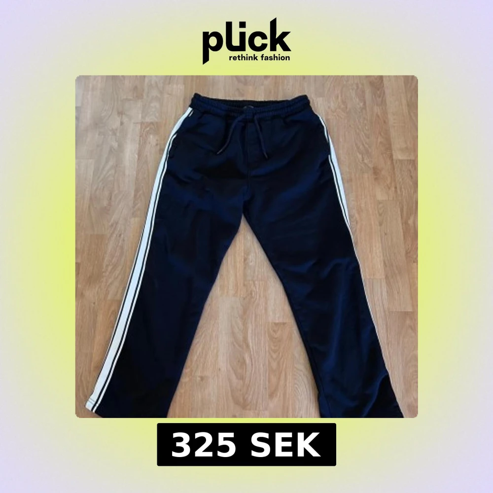 Svarta mjukisbyxor från Xside i storlek M. Byxorna har vita dubbla ränder längs sidorna, elastisk midja med snörning och raka ben.