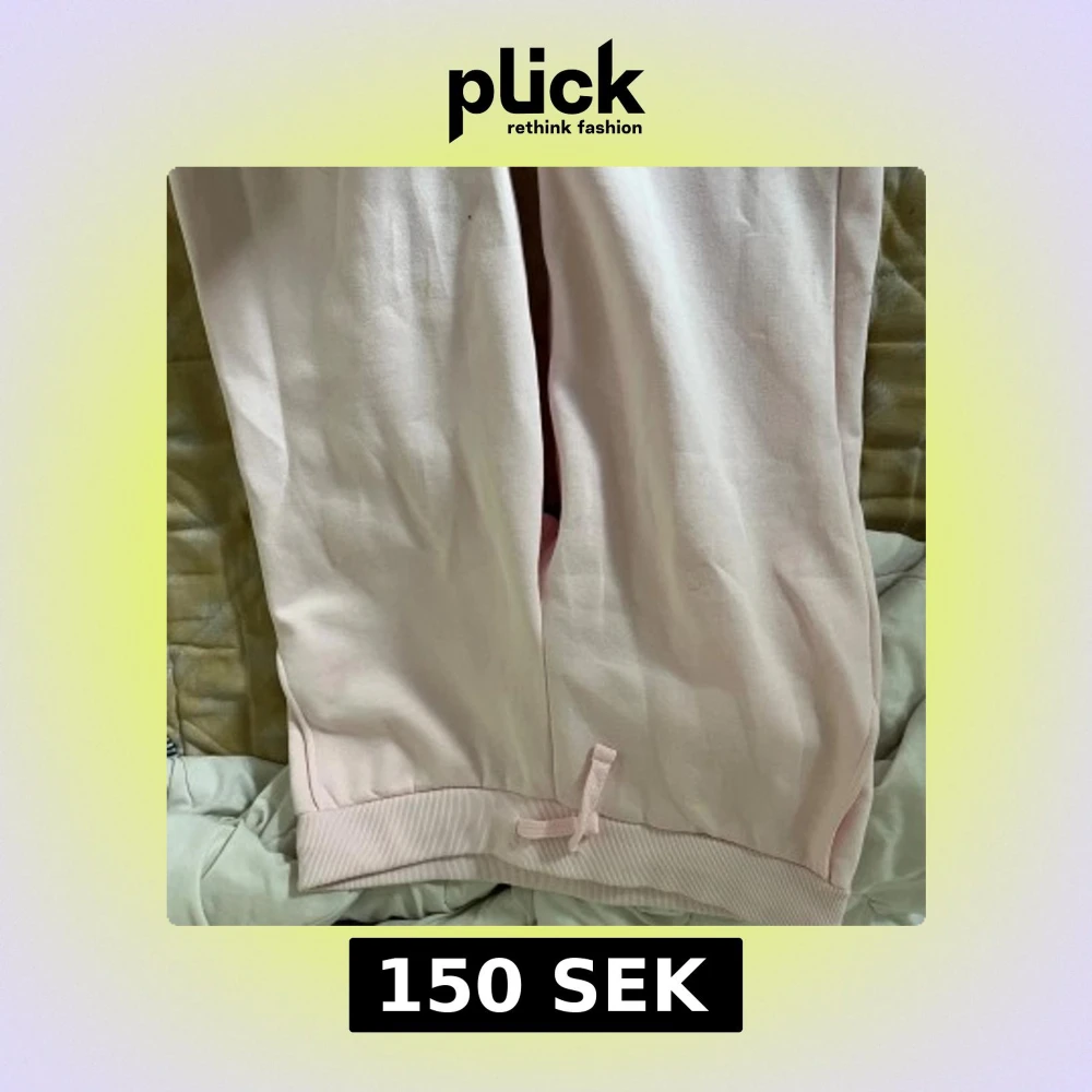 Säljer ett par ljusrosa mjukisbyxor med ribbade muddar och snörning vid benslut. Byxorna är i mjukt material och har en avslappnad passform, perfekta för chill dagar eller när du vill vara extra bekväm.