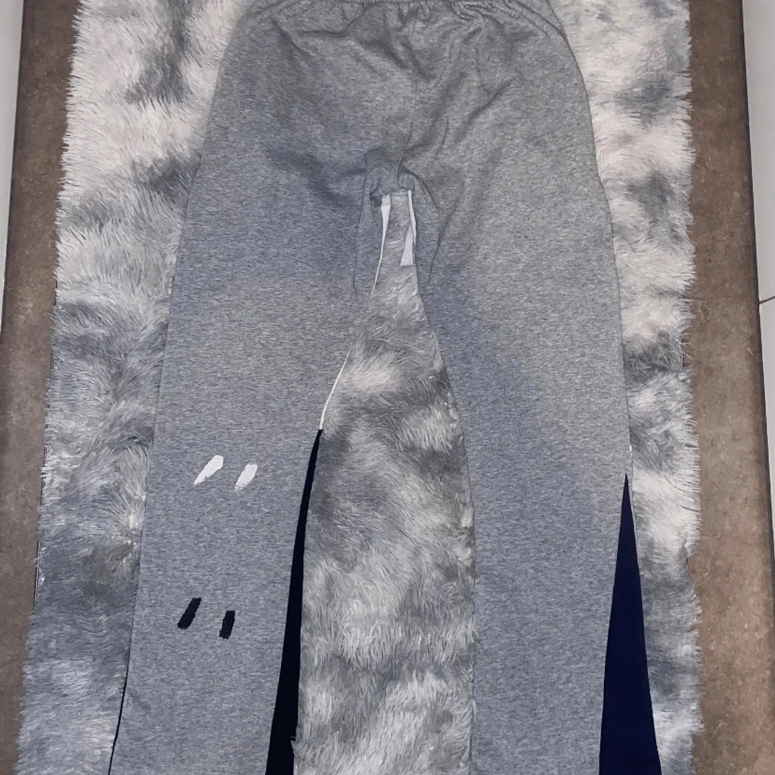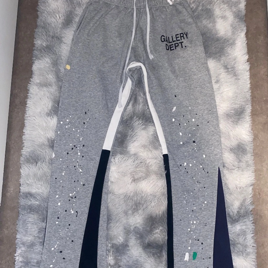 Grå mjukisbyxor från Gallery Dept. med vit snörning i midjan och tryckt logga på vänster höft. Byxorna har färgstänk i vitt, svart, grönt och gult samt mörkblå paneler längs benen. Tillverkade i 100% bomull för en skön och avslappnad vibe.