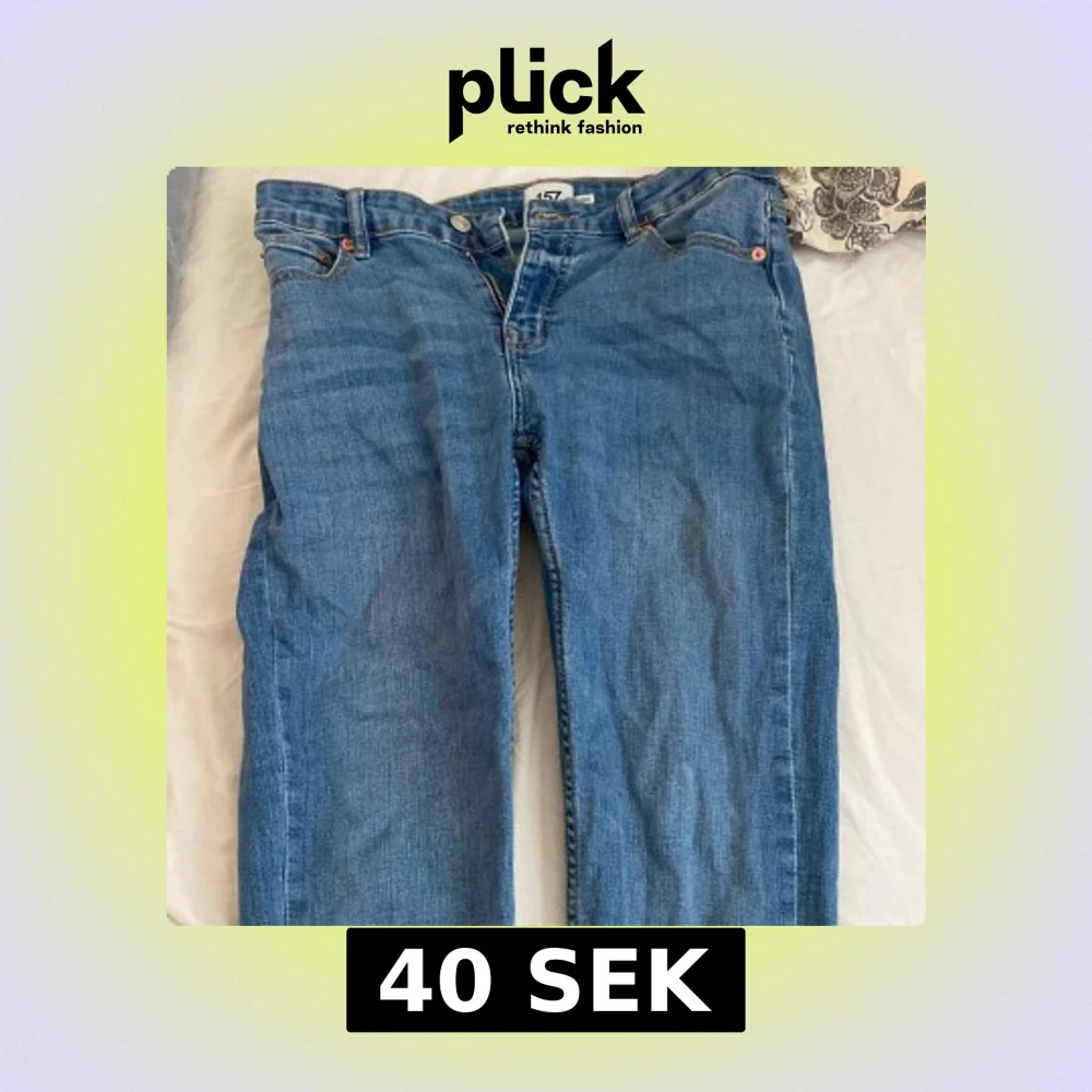 Säljer ett par klassiska blå jeansbyxor med normal passform. De har en traditionell femficksdesign och är tillverkade i slitstarkt denim. Perfekta för en avslappnad stil.
