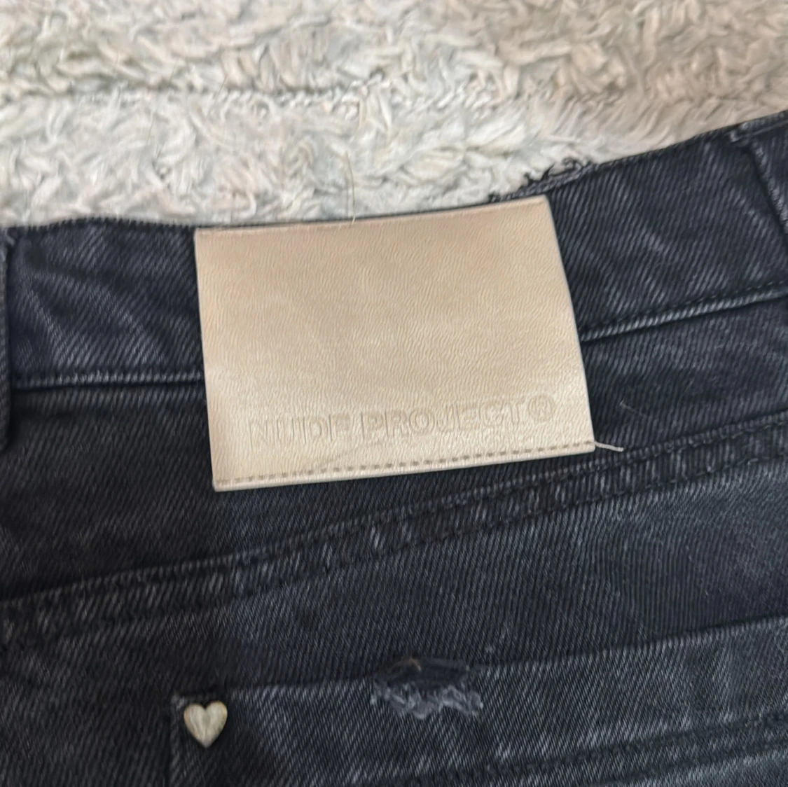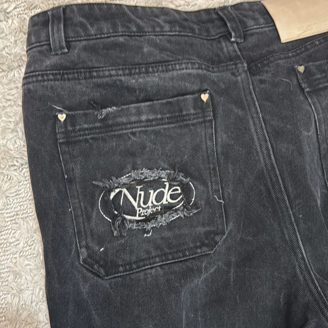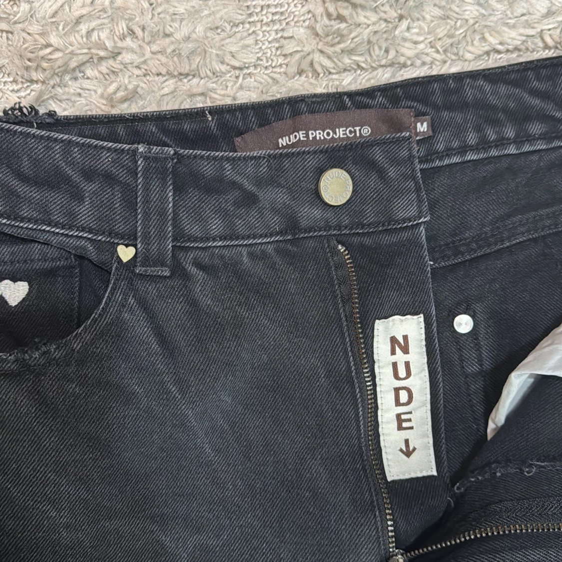 Svarta jeans från Nude Project med bred passform och coola detaljer som broderade hjärtan i guld och vitt vid fickorna. Baksidan har en rå kant med broderad Nude Project-logga. Materialet är klassisk jeans och dragkedjan har en unik Nude-etikett.