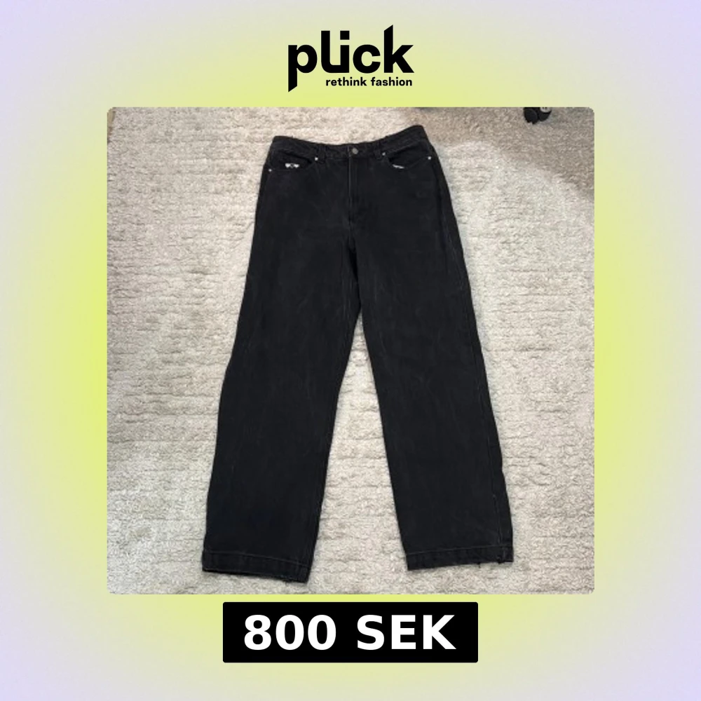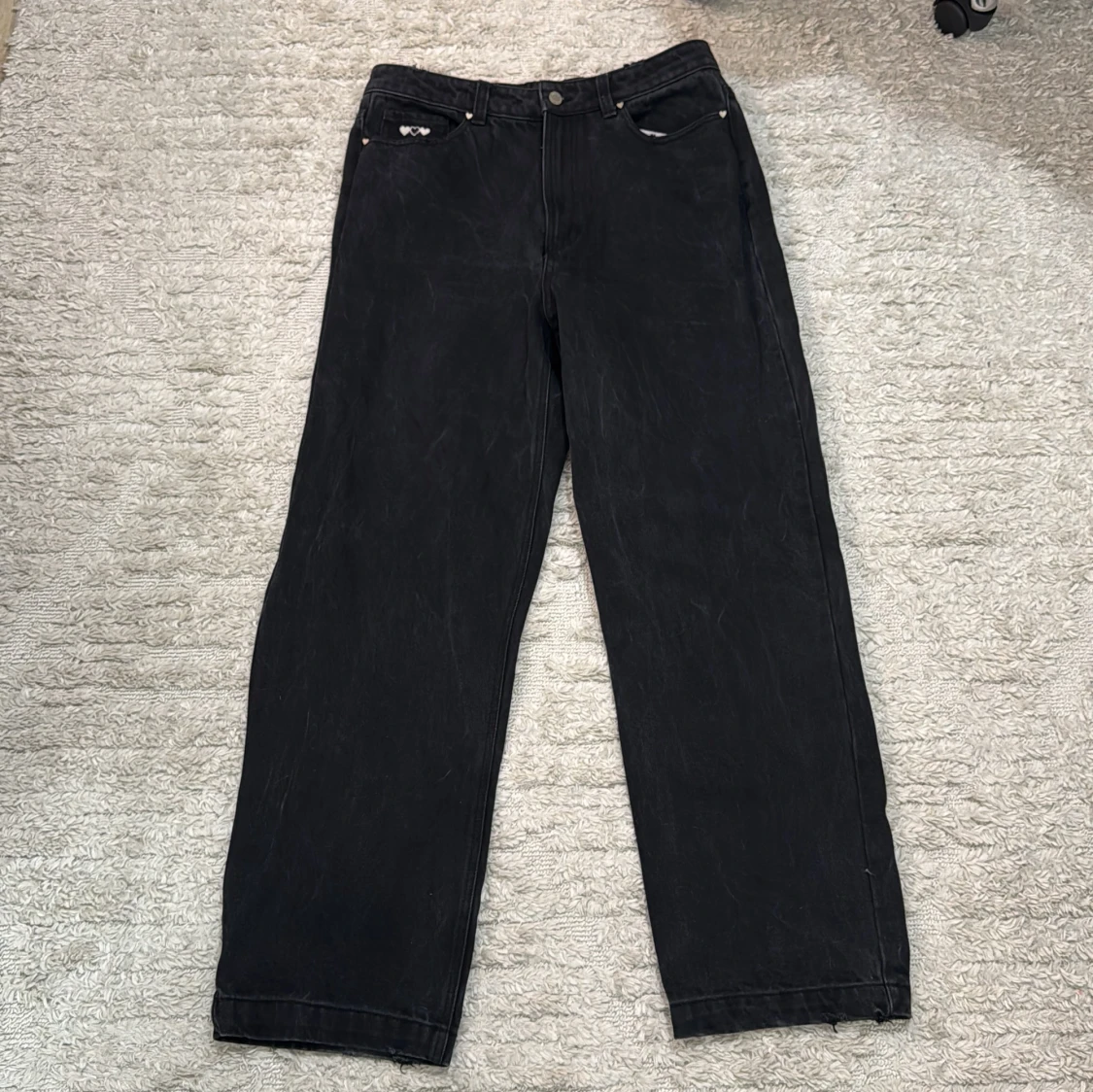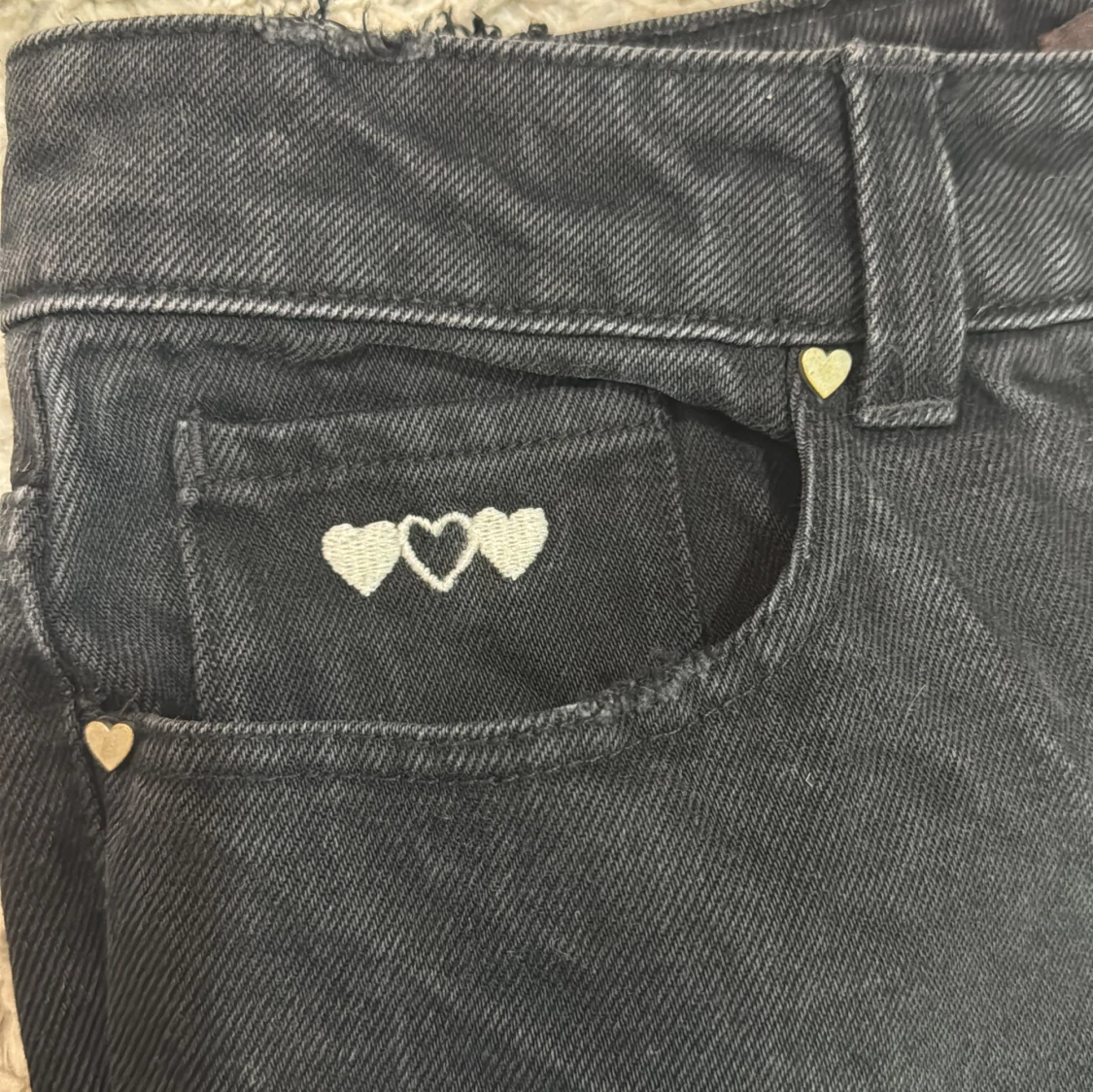 Svarta jeans från Nude Project med bred passform och coola detaljer som broderade hjärtan i guld och vitt vid fickorna. Baksidan har en rå kant med broderad Nude Project-logga. Materialet är klassisk jeans och dragkedjan har en unik Nude-etikett.