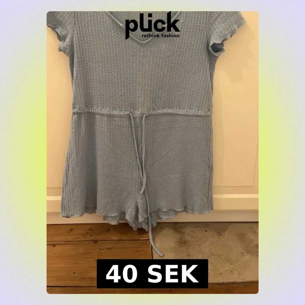 Säljer en ljusblå byxdress från SHEIN i storlek M. Den har korta ärmar, v-ringning och ett knytband i midjan. Materialet är ribbad syntet med en mjuk och luftig känsla. Perfekt för dig som gillar chill och enkel stil.