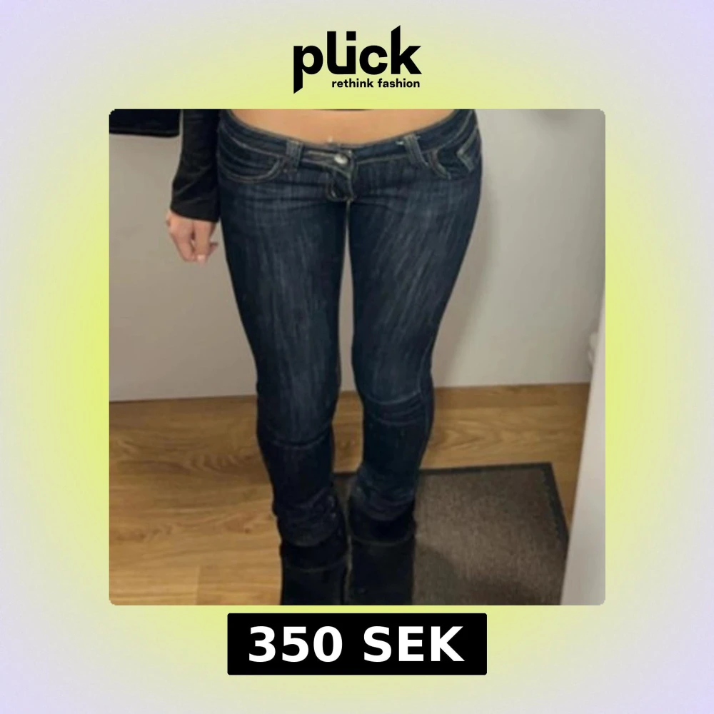 Säljer ett par mörkblå jeans med låg midja och smal passform. Jeansen har klassiska fickor fram och bak, samt tydliga kontrastsömmar. Storlek M men passar även S