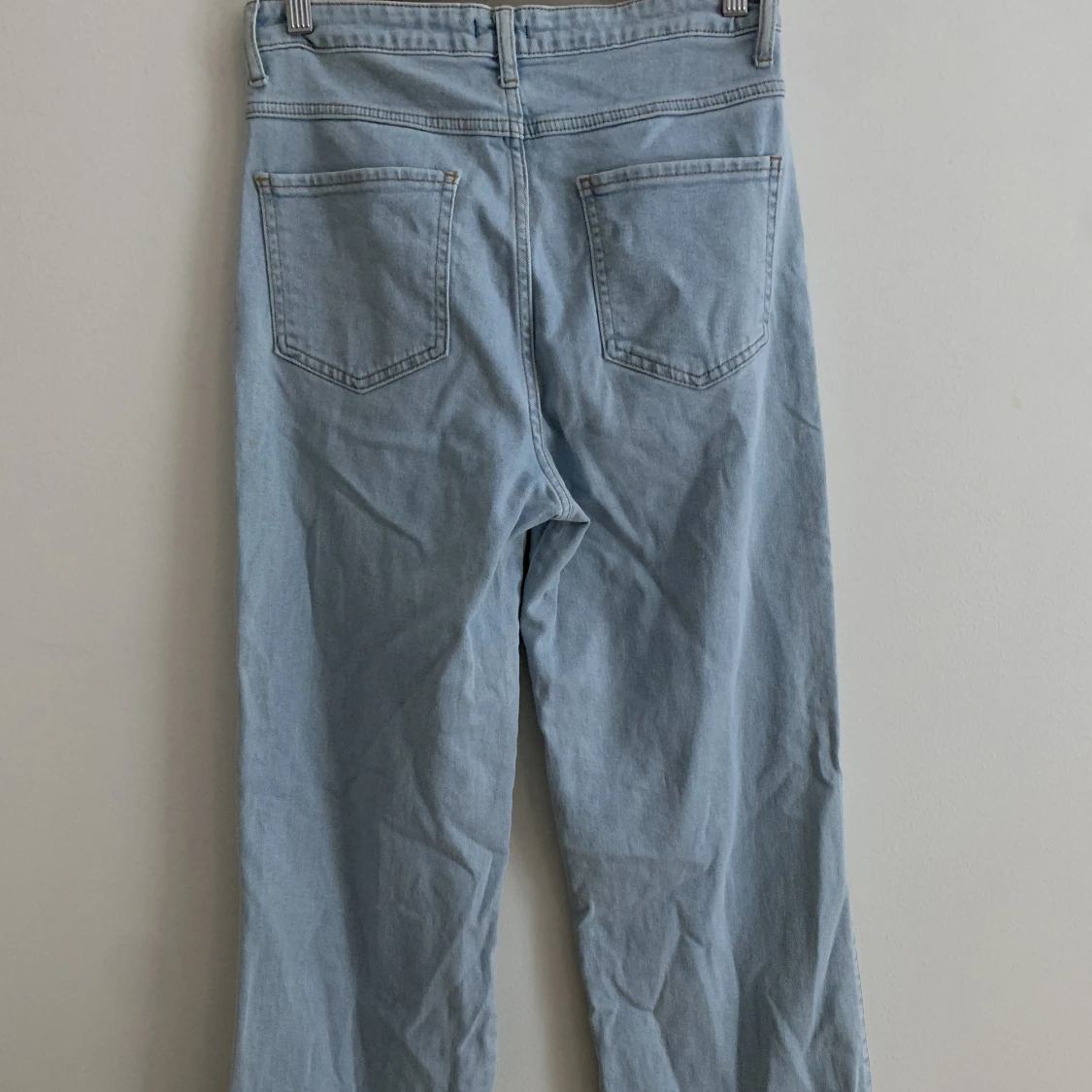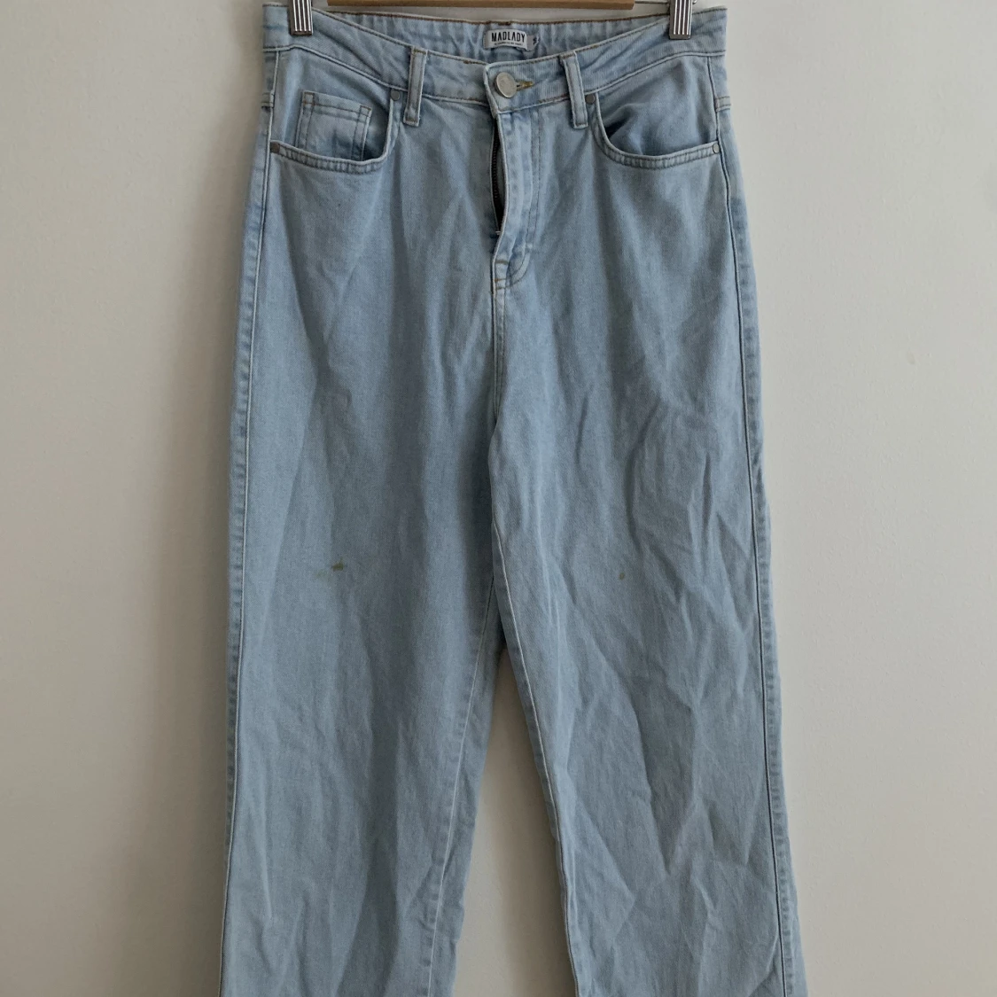 Ett par högmidjade jeans från madlady! Fin tvätt och sitter skönt, men det finns en liten fläck på högra benet. Märkte den inte vid fotograferingen, därför är dem inte tvättade, men den gick bort i tvätten.