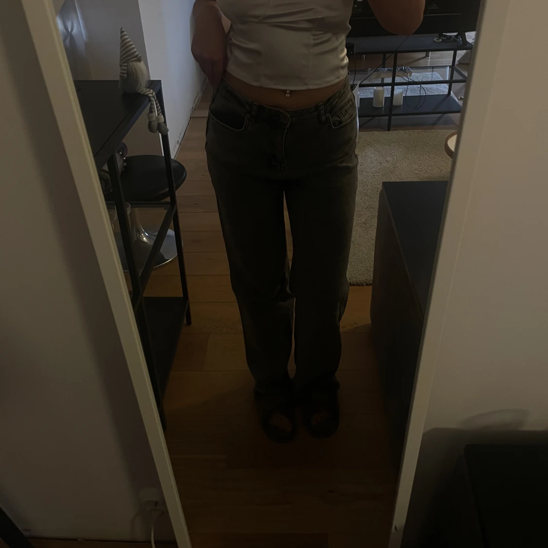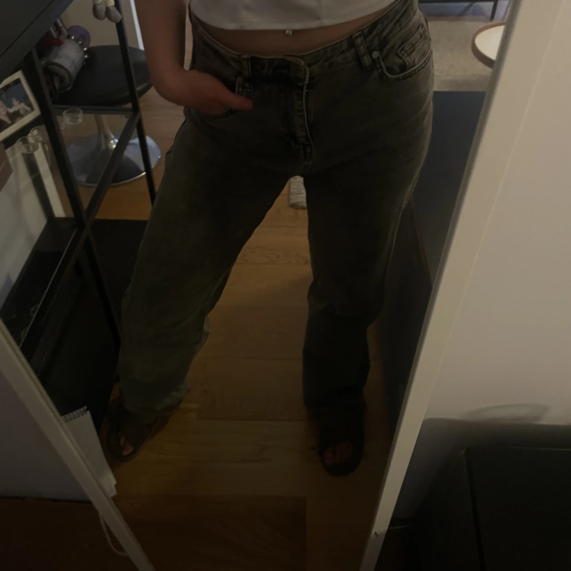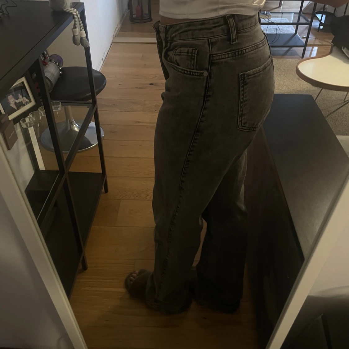 Gråa jeans från madlady som är så sjukt fina men inte längre kommer till användning! Långa i benen på mig som är 1.71 och sitter mid waist på mig och är storlek 38. Använd fåtal gånger. Skriv om du är intresserad eller annat🥰
