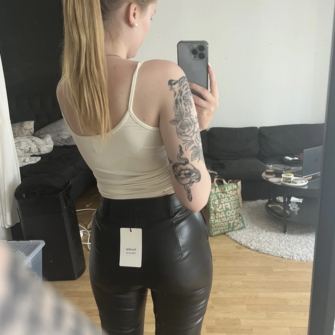 Väldigt snygga kostymliknande skinnbyxor. Lite småa skulle jag säga i storleken, men annars väldigt sköna🖤endast prövade och taggen kvar! Nypris 649:-