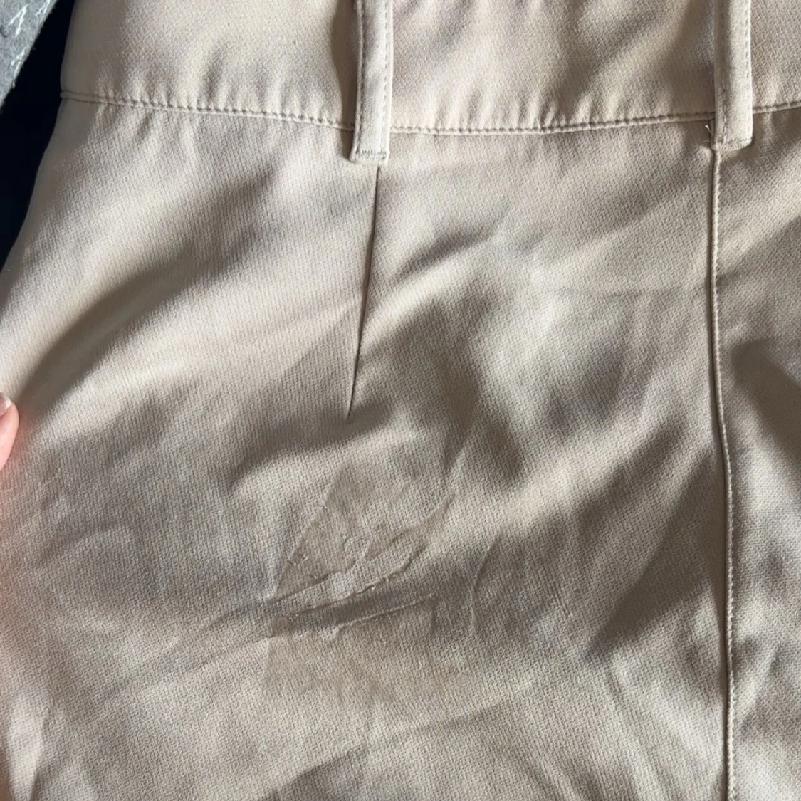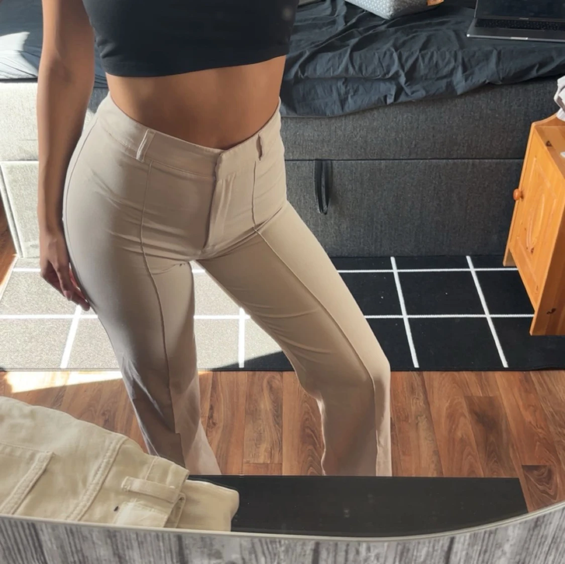 Snygga beiga kostymbyxor med hög midja och raka ben. Byxorna har pressveck framtill och stängs med dragkedja och knapp. Köpta från madlady för 600. Så himla fina och bra skick, men har ett märke där bak som hände när jag skulle stryka de, därav billigt pris💕storlek 36, längd 32.