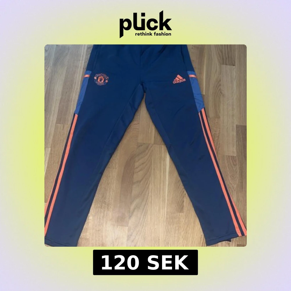 Mörkblå träningsbyxor från Adidas med Manchester United-logga och orangea detaljer längs sidorna. Byxorna har smal passform, elastisk midja och är tillverkade i ett syntetmaterial som andas. Perfekta för fotbollsträning eller chill.