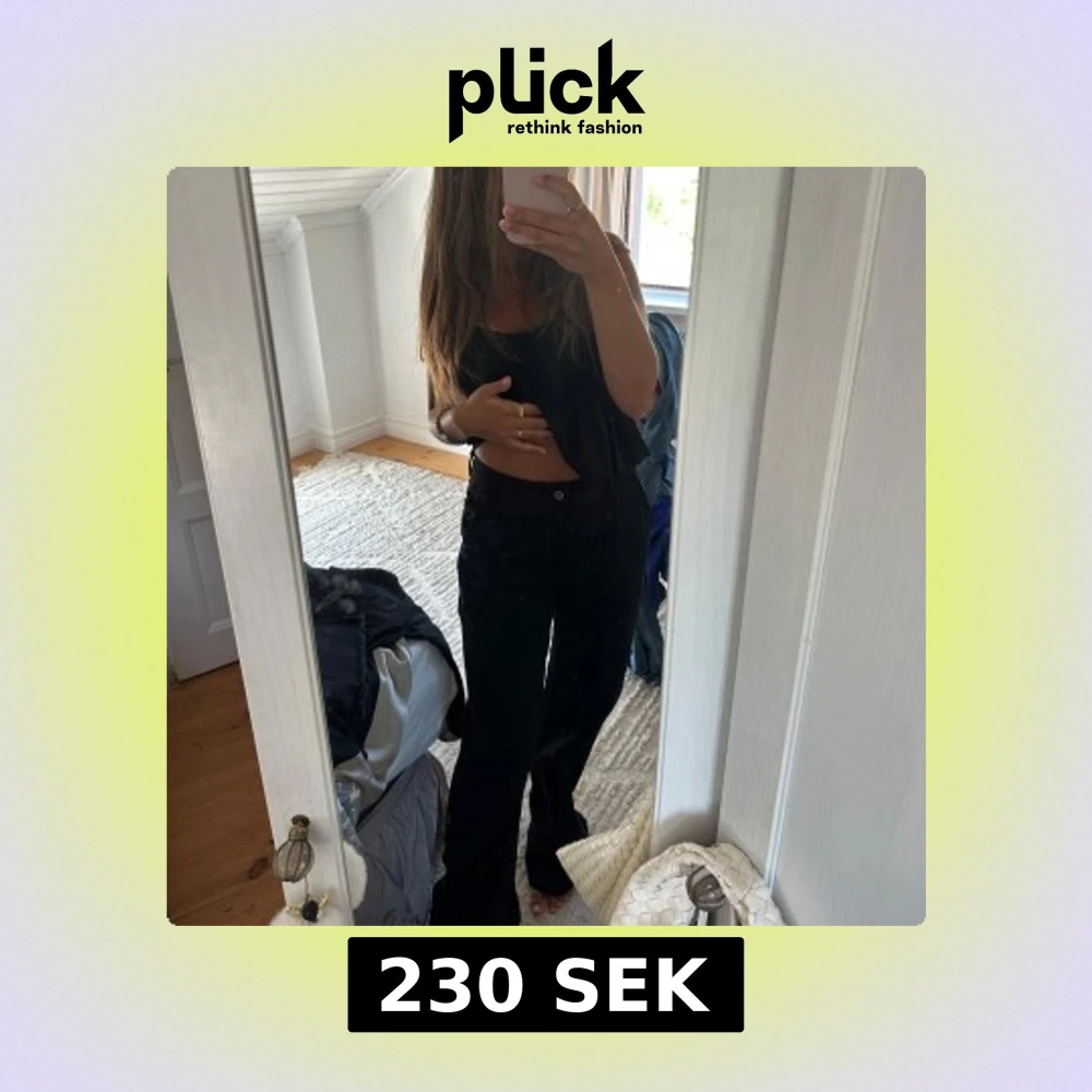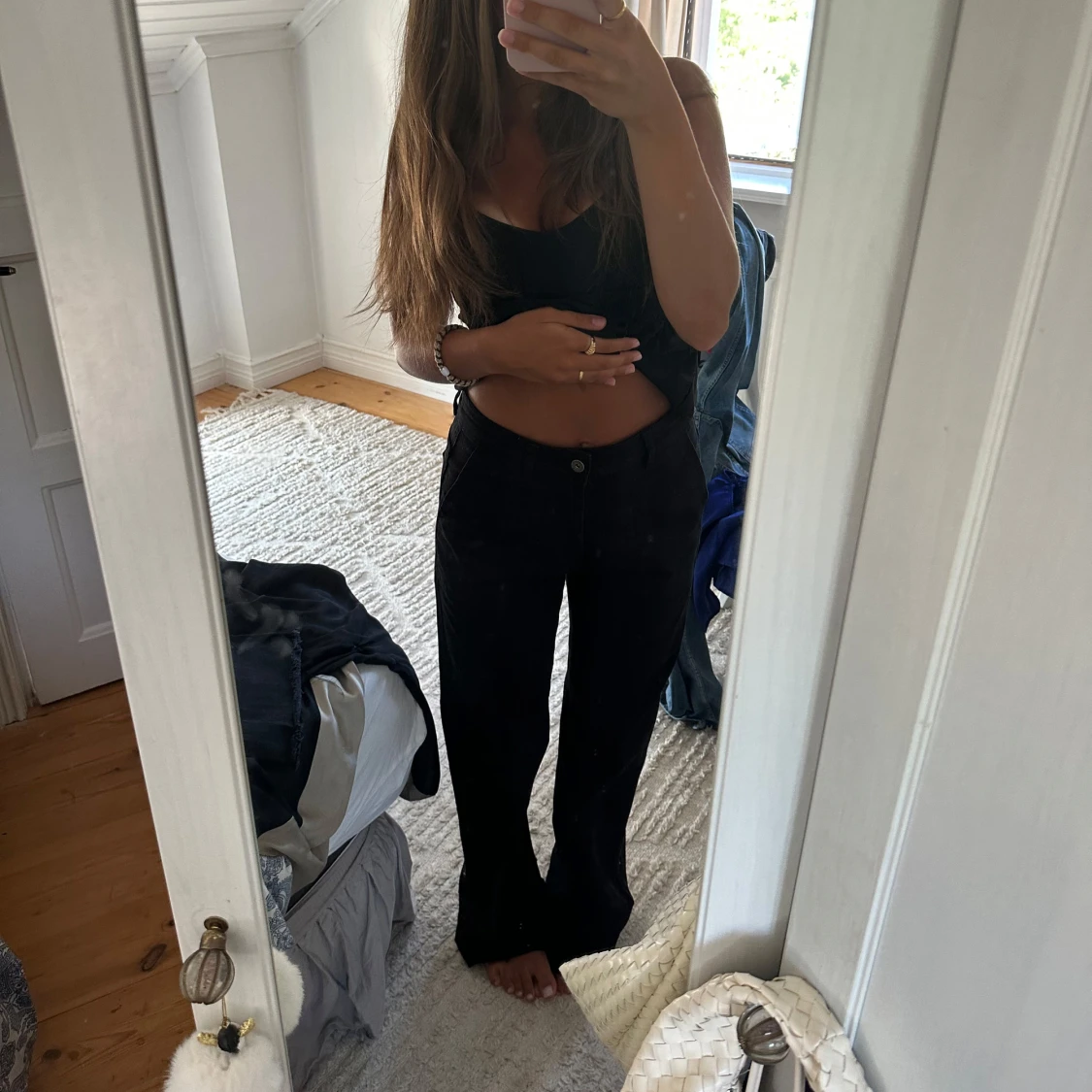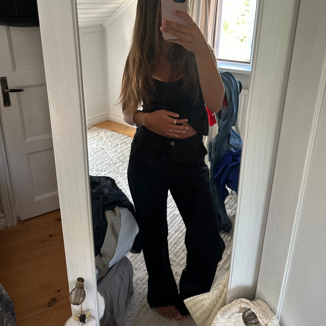 Säljer ett par svarta byxor med bootcut och hög midja. De har klassisk femficksdesign och raka ben som blir vidare nertill. Snygga till crop top eller hoodie och passar perfekt om du gillar en clean och stilren look.