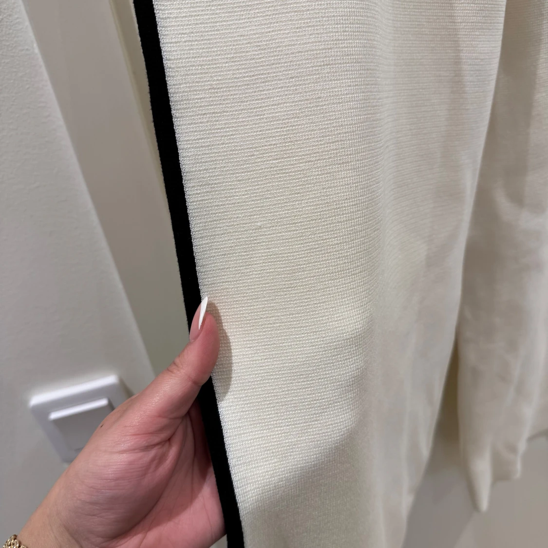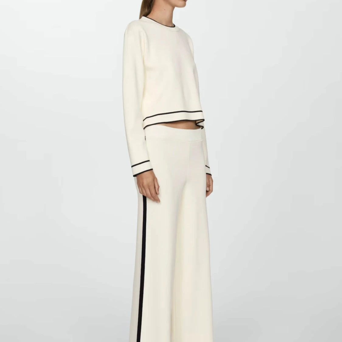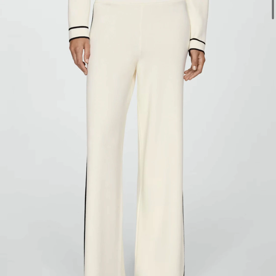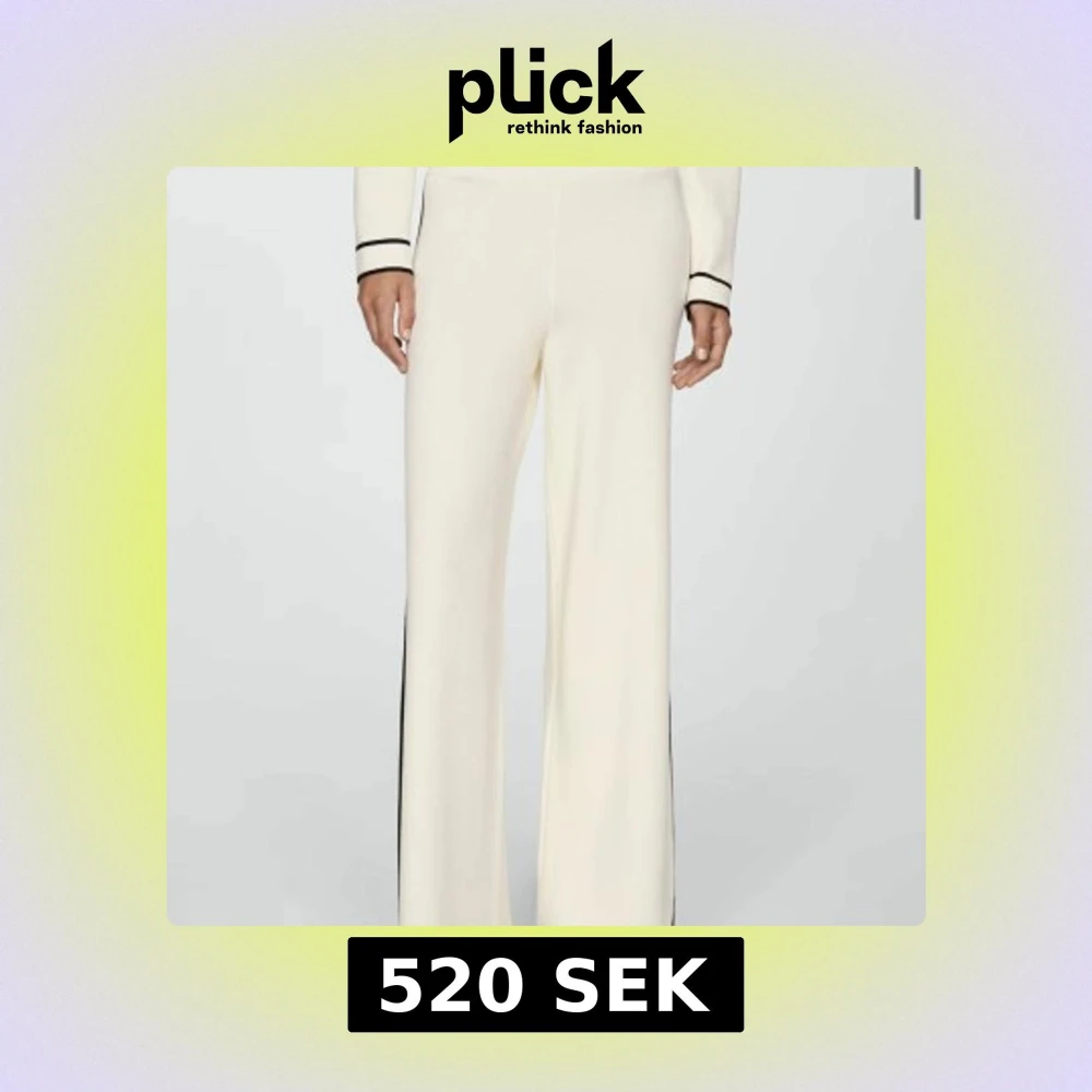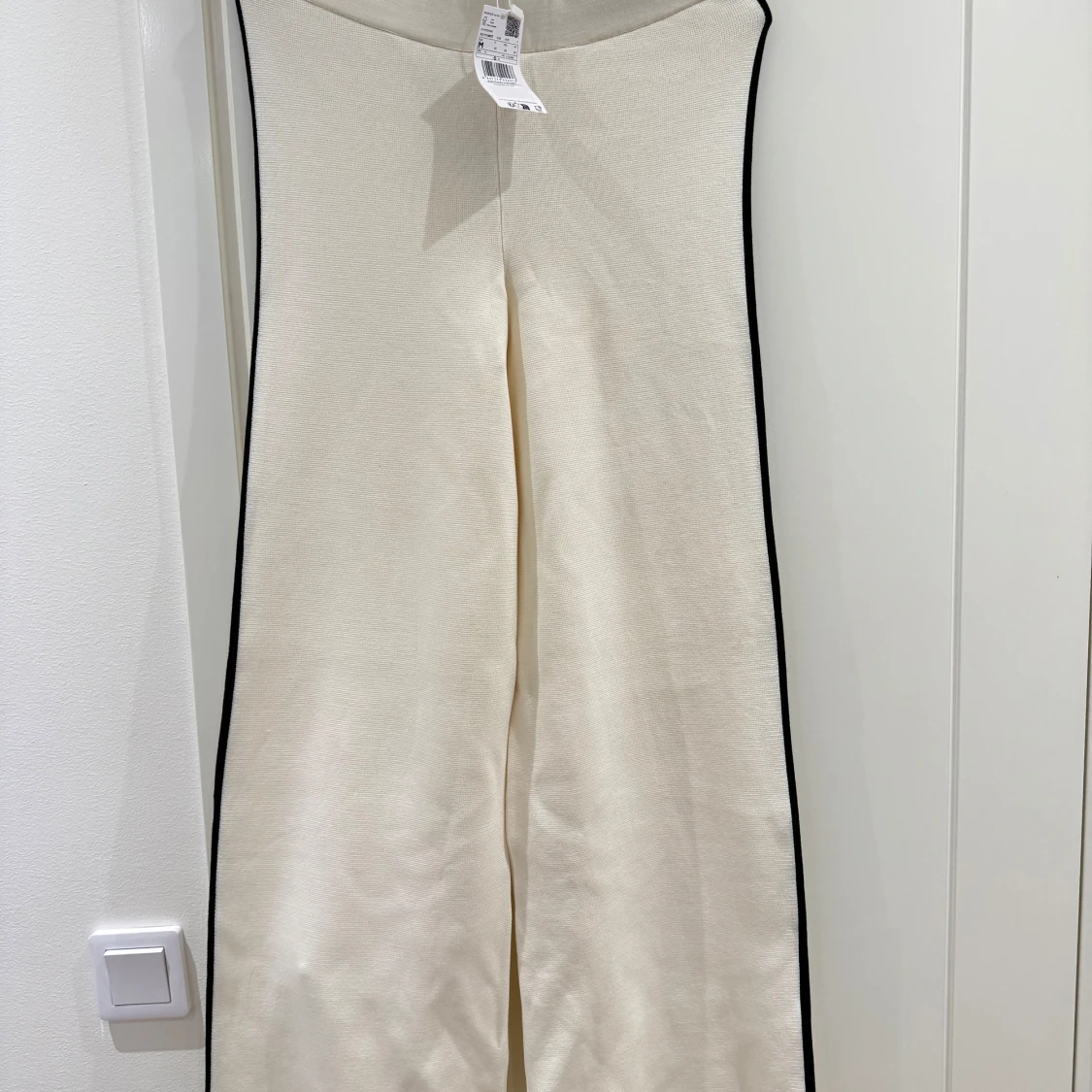 Snygga vita byxor med vida ben och svarta ränder längs sidorna. Byxorna har en hög midja och är tillverkade i ett stickat material som känns mjukt och bekvämt. Perfekta för en stilren och trendig look. NYPRIS 600kr!! Storlek M🥰