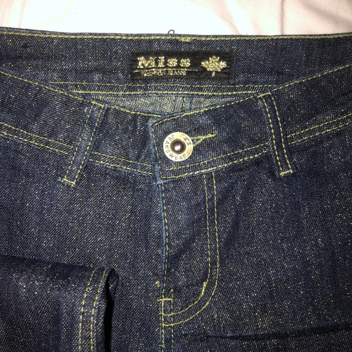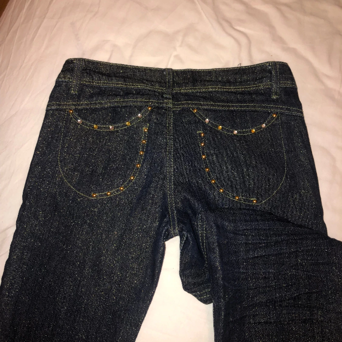 Lowwaist marinblå bootcut jeans med guldglittrigt tyg