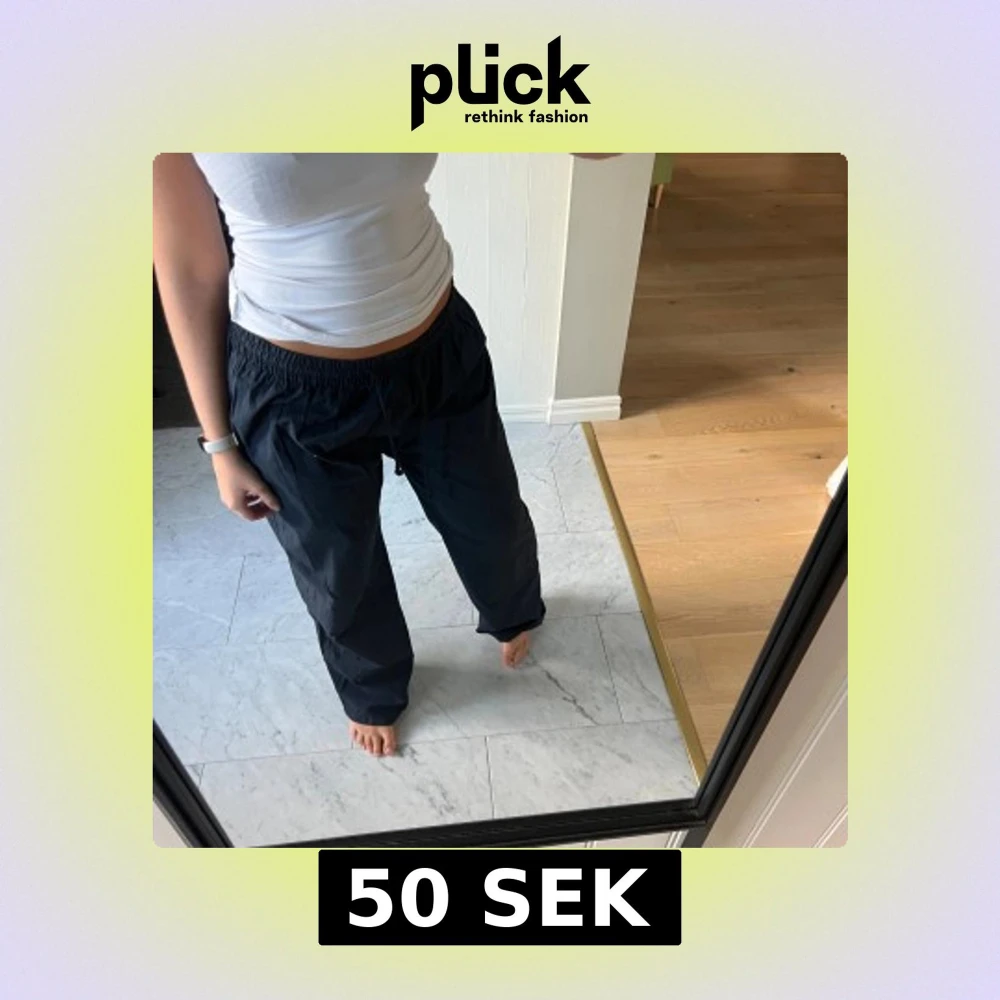 Säljer ett par marinblå byxor med loose passform och elastisk midja med snörning. Byxorna har breda ben och är gjorda i ett lätt syntetmaterial som passar perfekt🥰