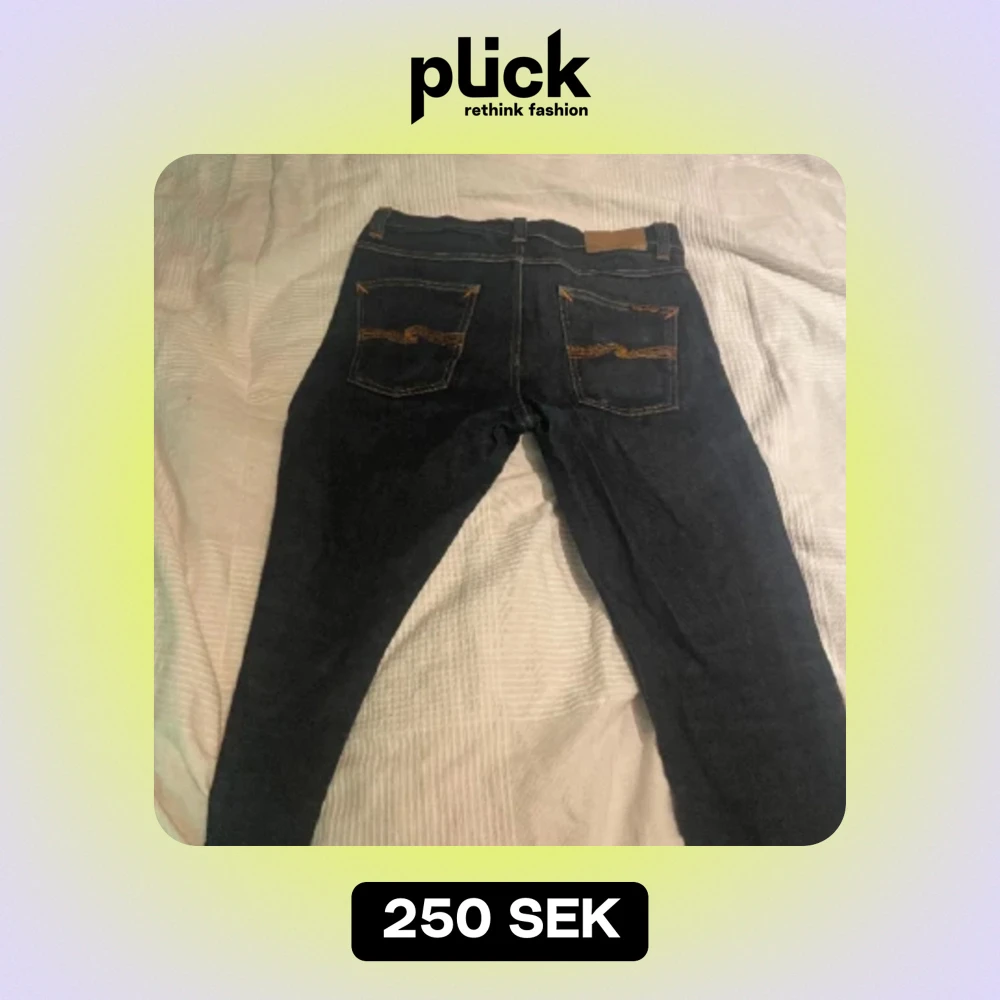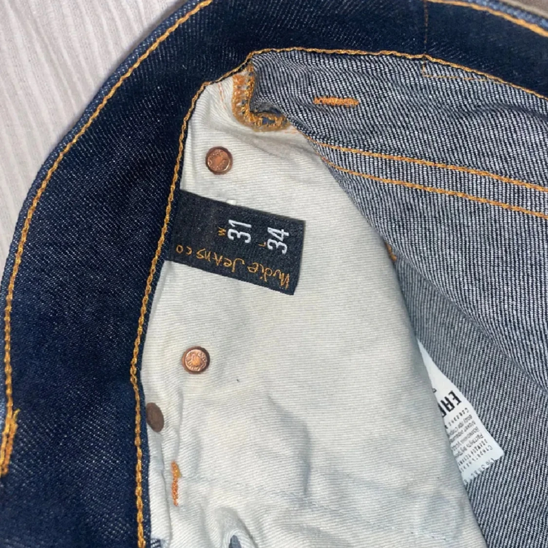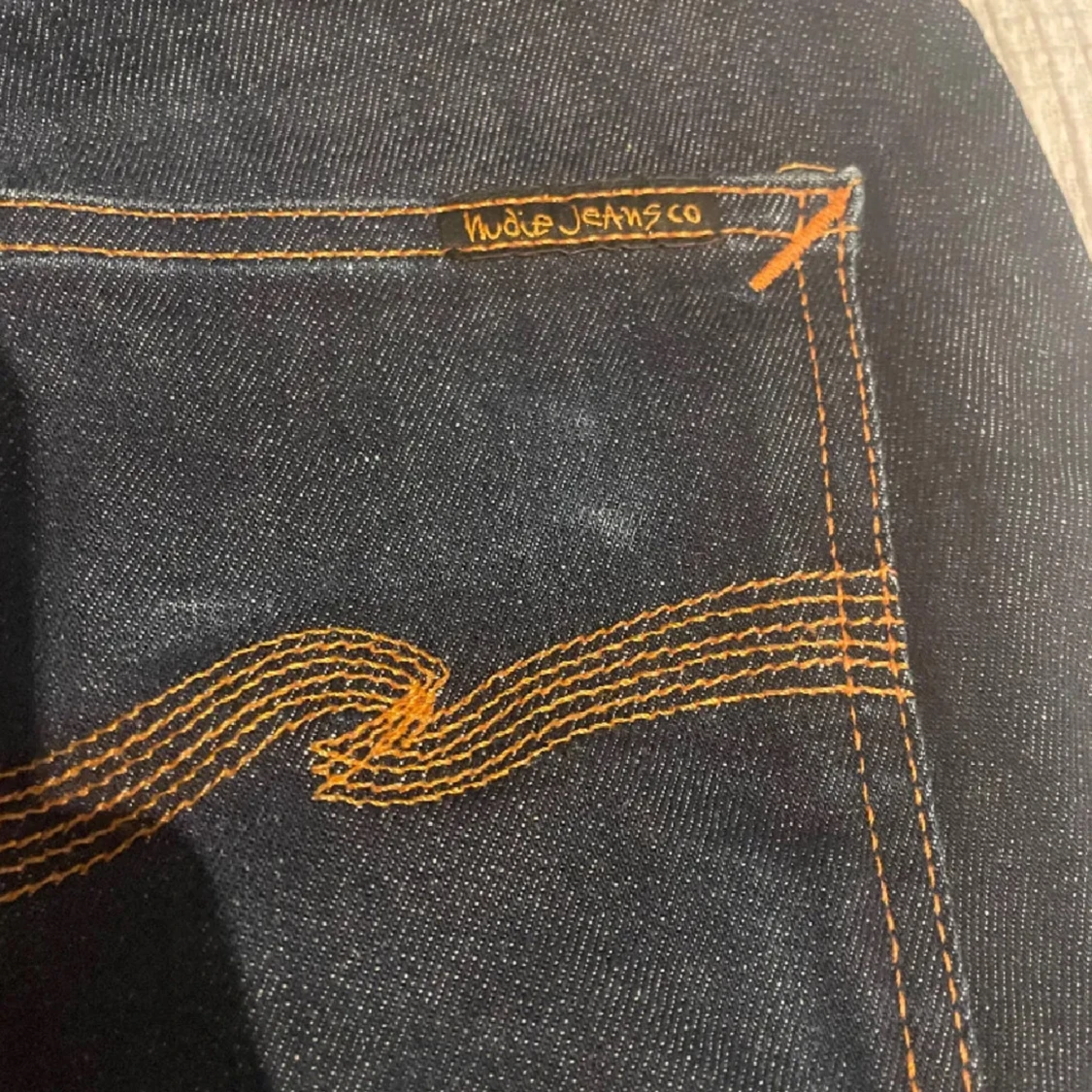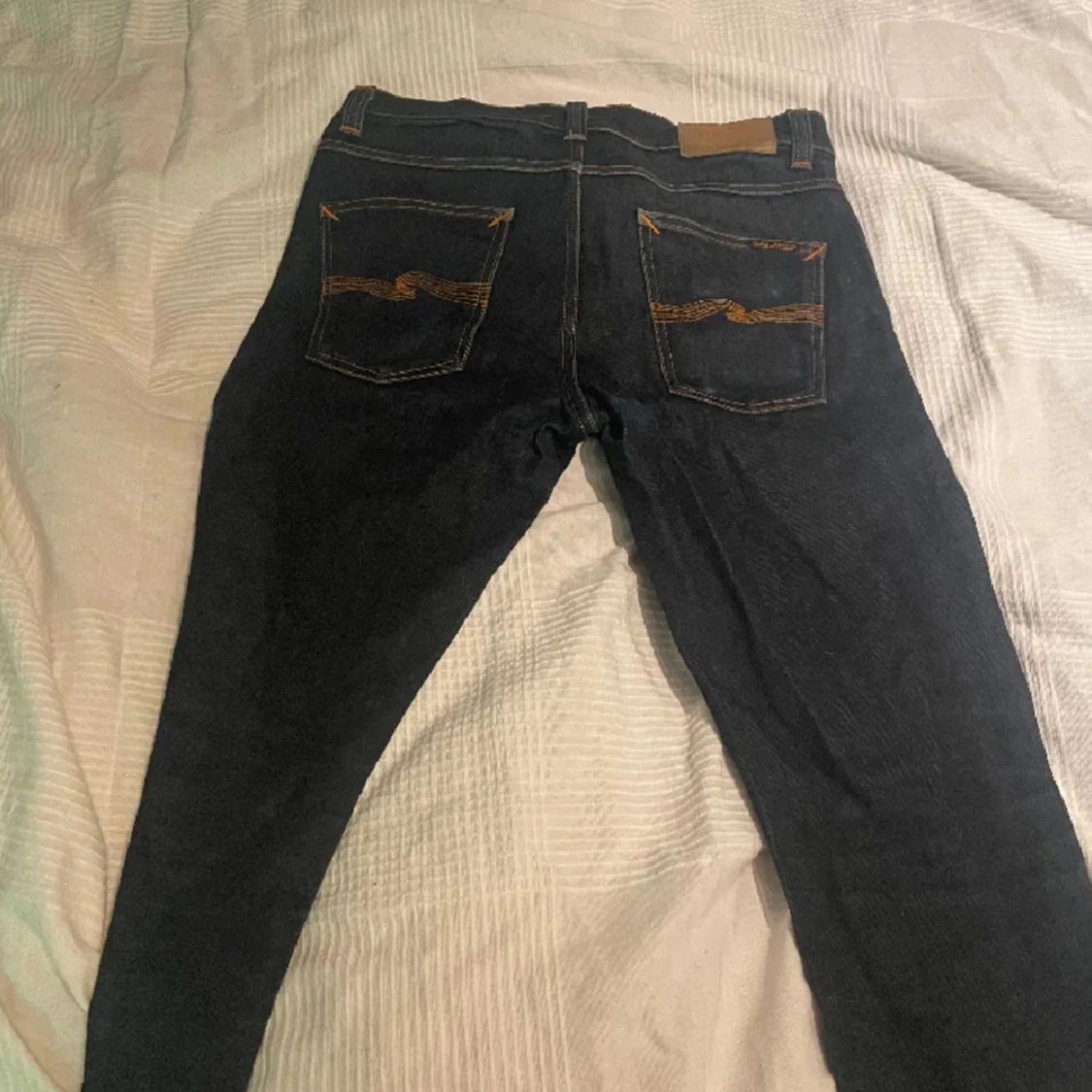 Säljer ett par snygga mörkblå jeans från Nudie Jeans. De har en klassisk design med orange sömmar och en bekväm passform. Perfekta för både vardag och fest! 31/34