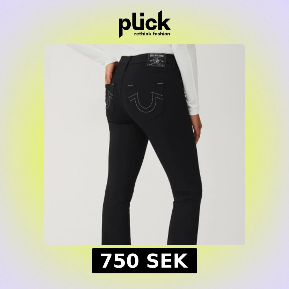 Svarta Ponte byxor från True Religion med bootcut passform och klassiska kontrastsömmar på bakfickorna. Snyggt broderad logga baktill och normal midja. Byxorna har stretchig känsla och sitter tajt upptill med utsvängda ben. Säljs då de inte passar mig så bra.