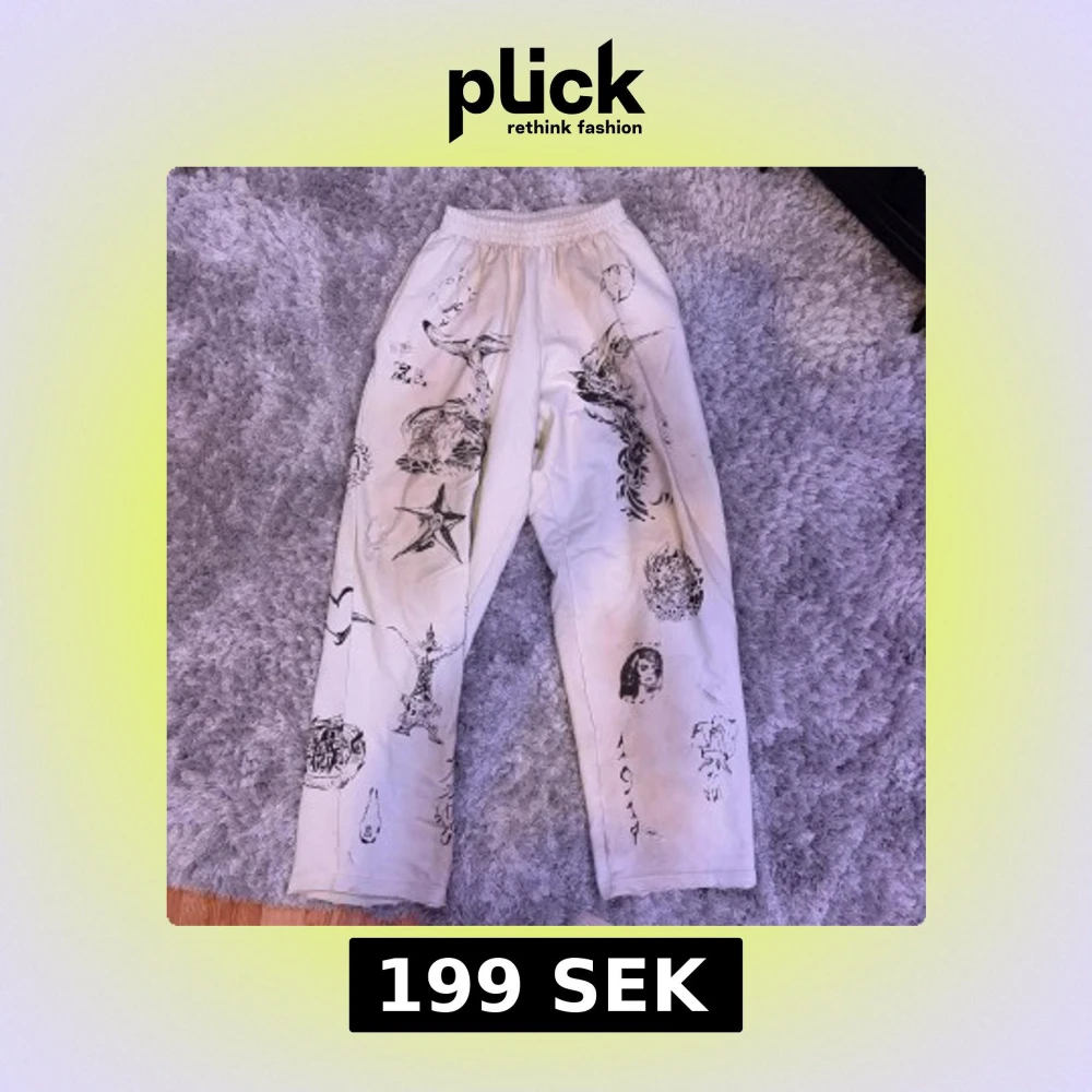 Unika vita sweatpants från Balenciaga med elastisk midja och coola svarta grafiska prints över hela byxorna. Byxorna har en loose passform och är gjorda i mjuk bomull, perfekta för en avslappnad och trendig look. Säljes billigt pga det finns fläckar på dem.