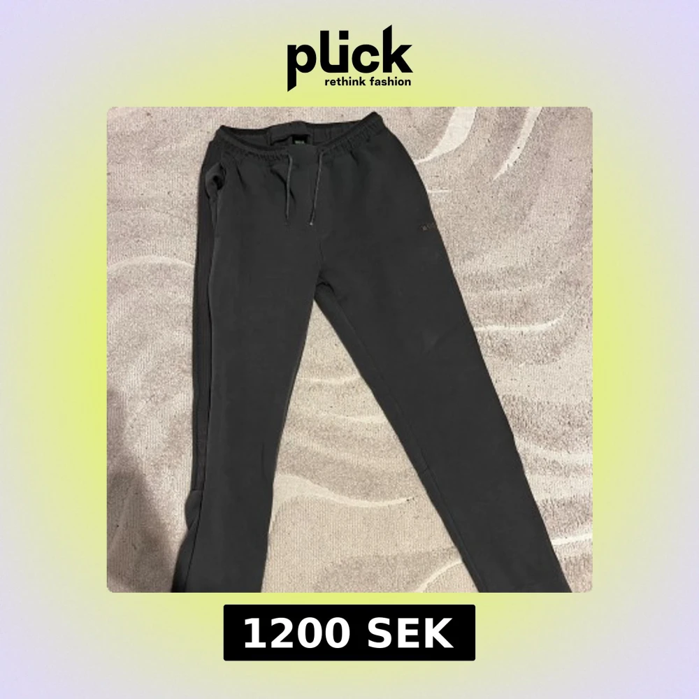 Mörkgrå mjukisbyxor från Hugo Boss med ribbade detaljer längs sidorna. I storlek S. Nypris 1500kr