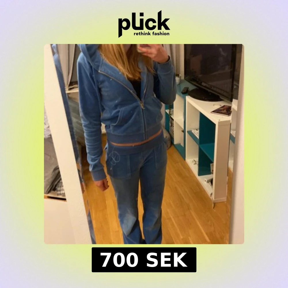Säljer ett snyggt och mjukt juicy sett i färgen blå! Byxorna är i storlek XS och tröjan är i storlek S. Bra kvalité men lite smutsiga längst ner vid hälarna men absolut inget man tänker på. Snöret saknas på byxorna