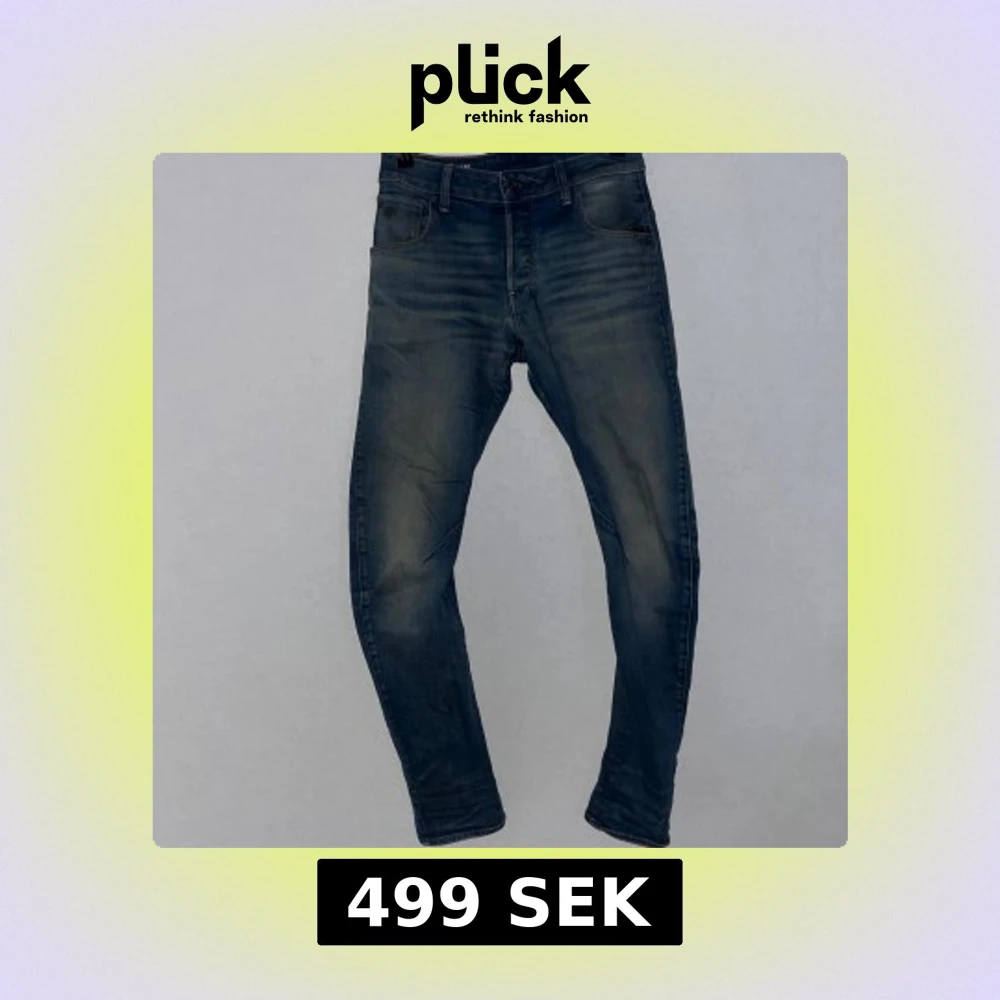 Snygga blå jeans från G-Star RAW med slim passform. Passar en xs-s beroende på hur man vill att de ska sitta. De har en klassisk femficksdesign och knappar i gylfen. W27 L32. Bilderna är tagna med blixt