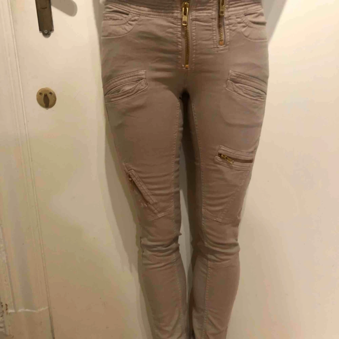 Coola byxor med guldkedjor som detaljer från By Marlene Birger. Storlek 26/32. Personen är 170 cm och har storlek small.