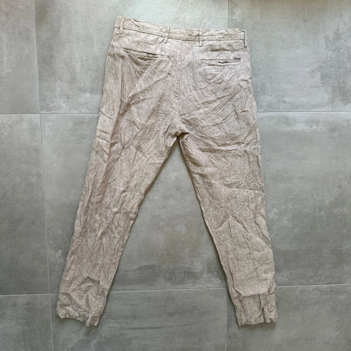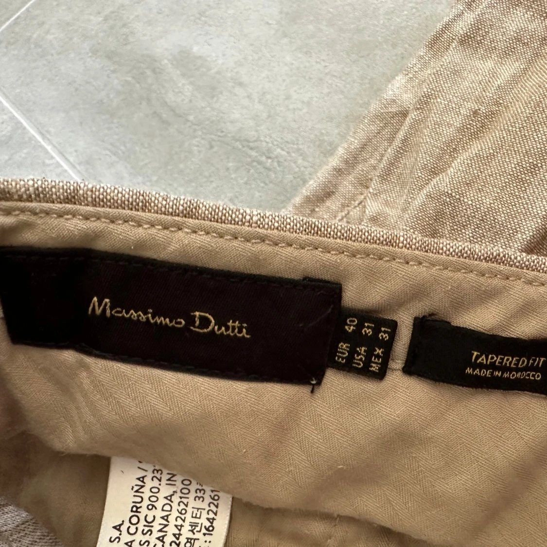 Snygga beige byxor från Massimo Dutti i tapered fit. Tillverkade i en mix av polyester och bomull, med klassisk design, bälteshällor och fickor både fram och bak. Perfekta för en clean och stilren look.