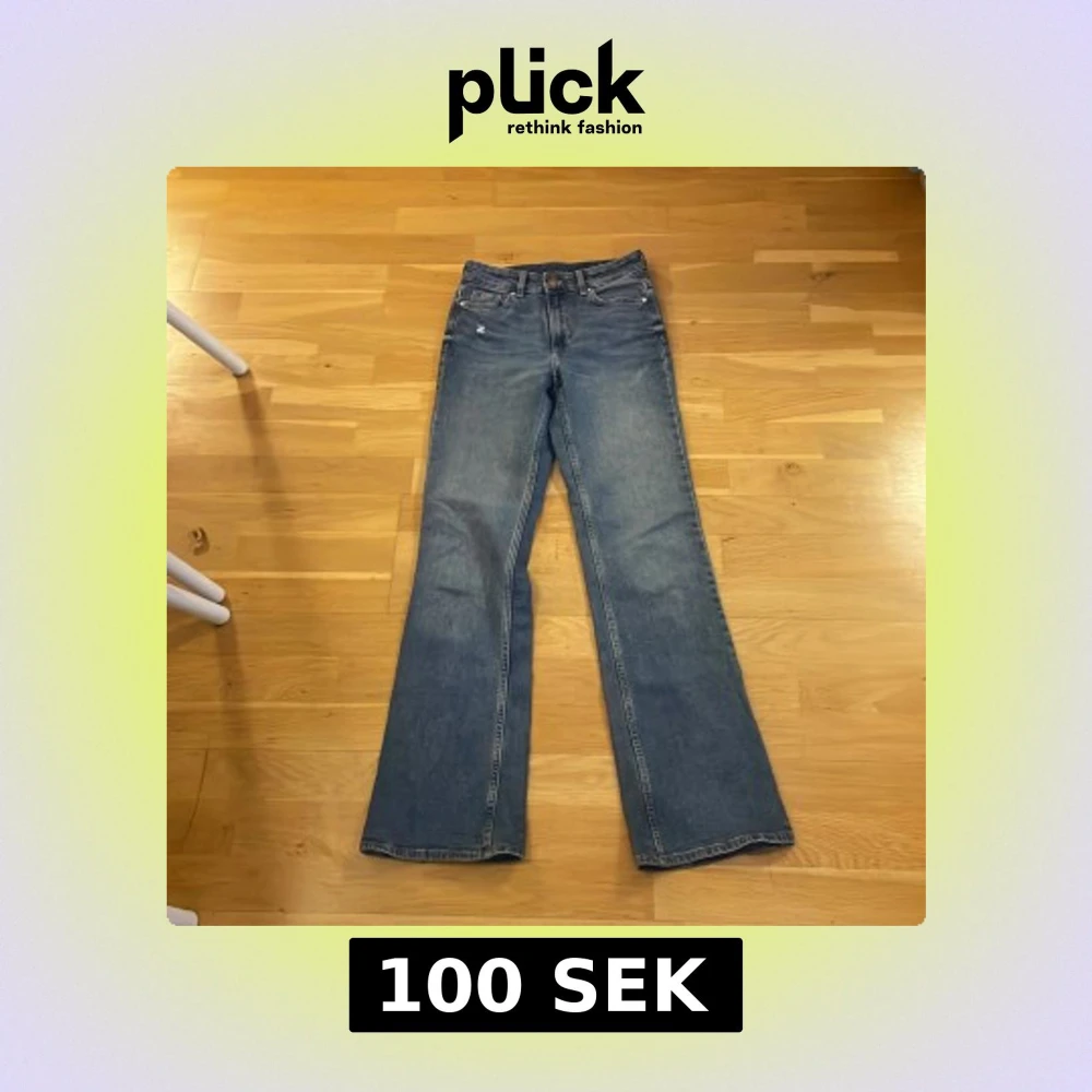 Snygga blå bootcut jeans. Perfekta för en avslappnad stil. Tillverkade i denim med klassisk femficksdesign och knappgylf. Skulle inte påstå att de är highwaist!! Kom privat om för frågor!