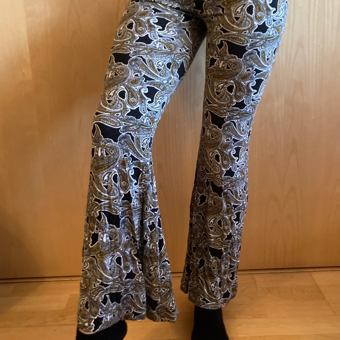 Elegant medallion patterned, gold and black color yoga pants with flare. Used only a few times since they are too big for me, size L. Hugs and enhances curves.