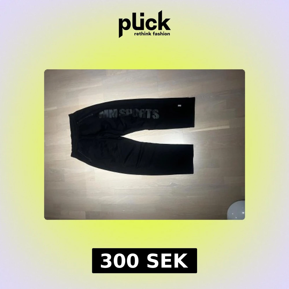 Svarta mjukisbyxor från MM Sports med stort tryck längs benet. Byxorna har dragkedjefickor och en bekväm, loose passform. Perfekta för chill eller träning, med stilren design och mjukt material.