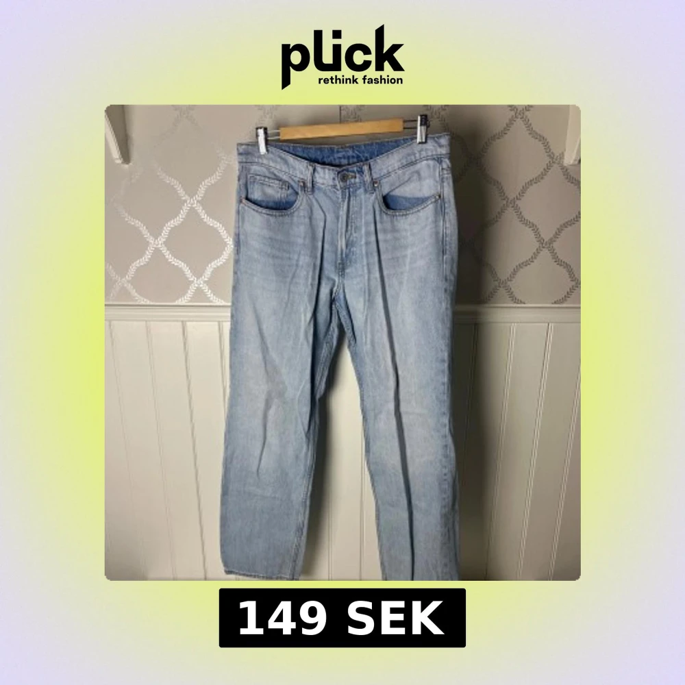 Snygga raka ljusblå jeansbyxor med klassisk femficksdesign. De har en dragkedja och knapp framtill. Perfekta för en avslappnad stil. Se fläck på sista bilden. (Kan tvättas och strykas innan dem skickas.)