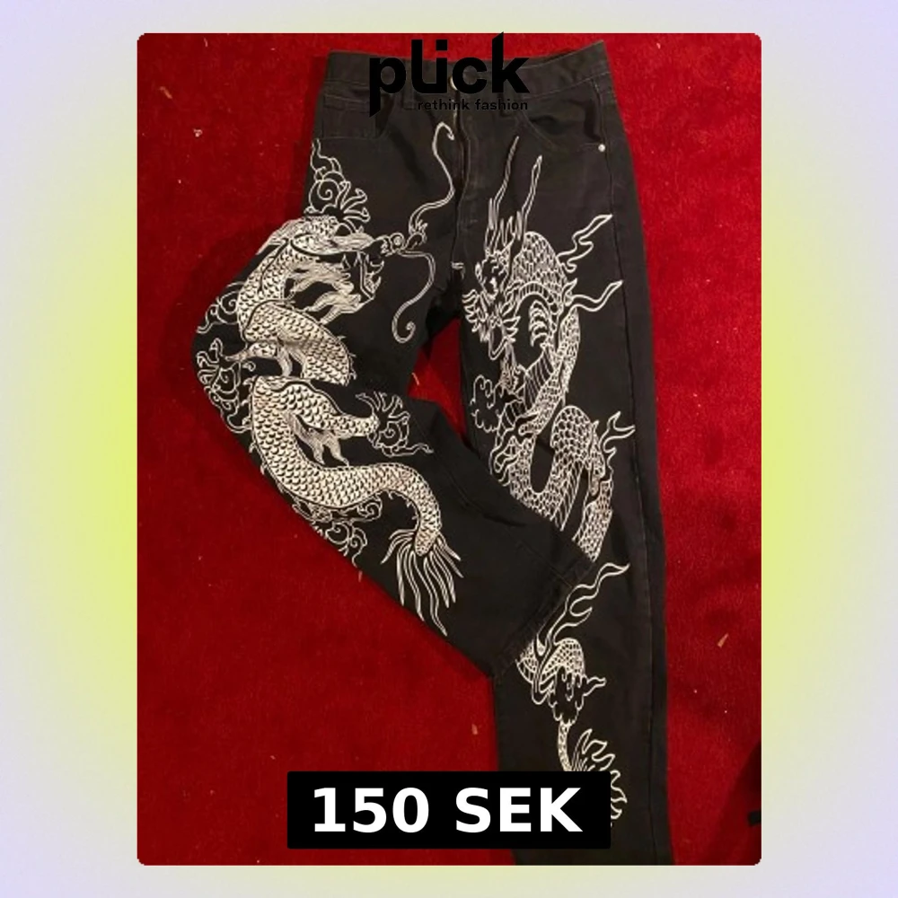 svarta jeans i storlek XS med ett fett vitt drakmönster som täcker båda benen. straight cut, hög midja. det är shein MEN de är bomull så det är verkligen inget problem med kvaliteten. nästan aldrig använda
