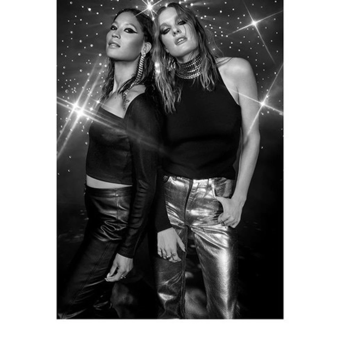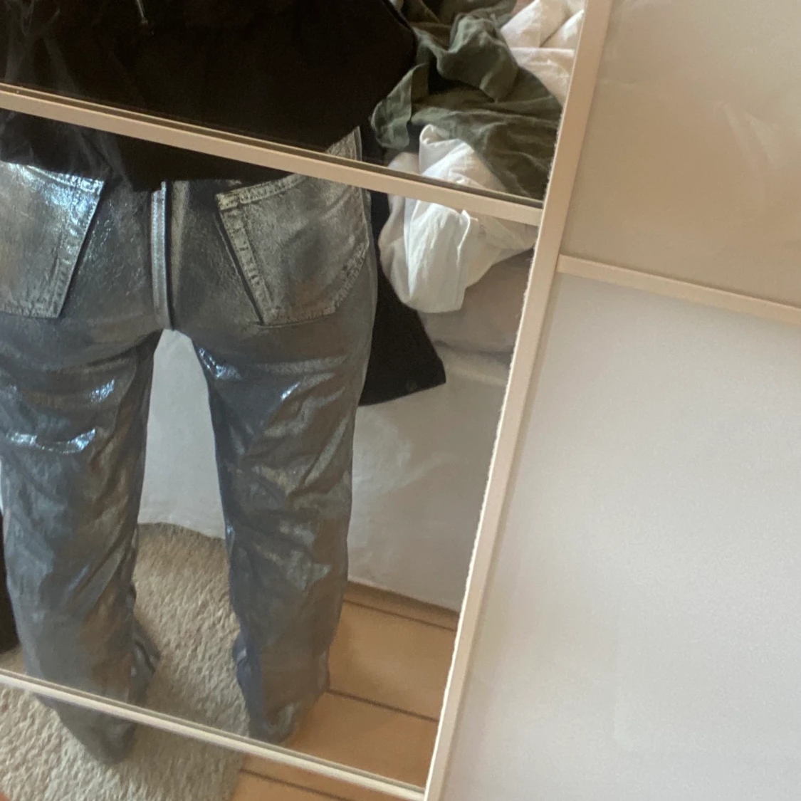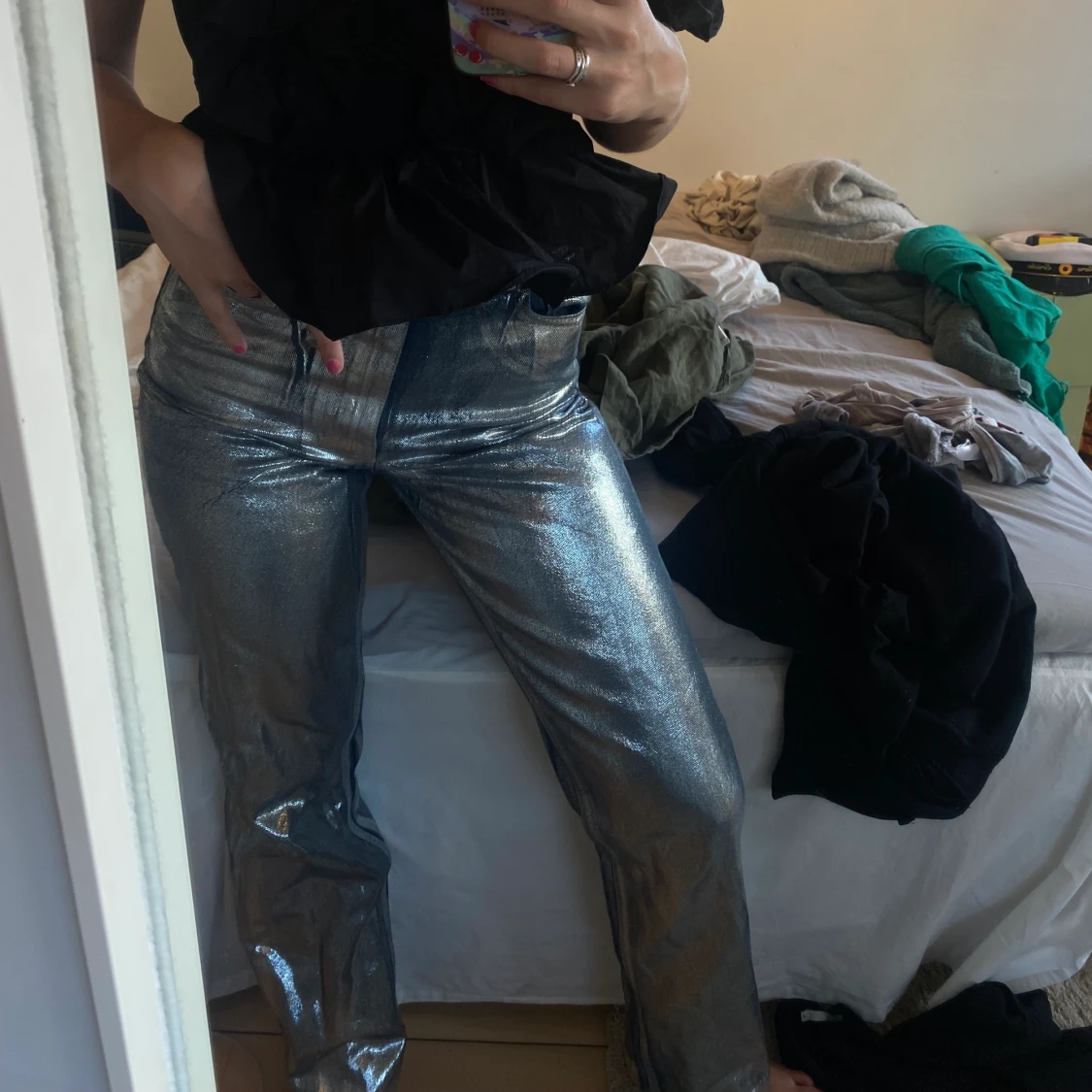 Silvriga/glitter jeans från Gina Tricot x Icona Pop. Köpta nya för ca 500, säljer för 150 +frakt Ganska stretchiga i storlek 34, och passar med mig i storlek 36