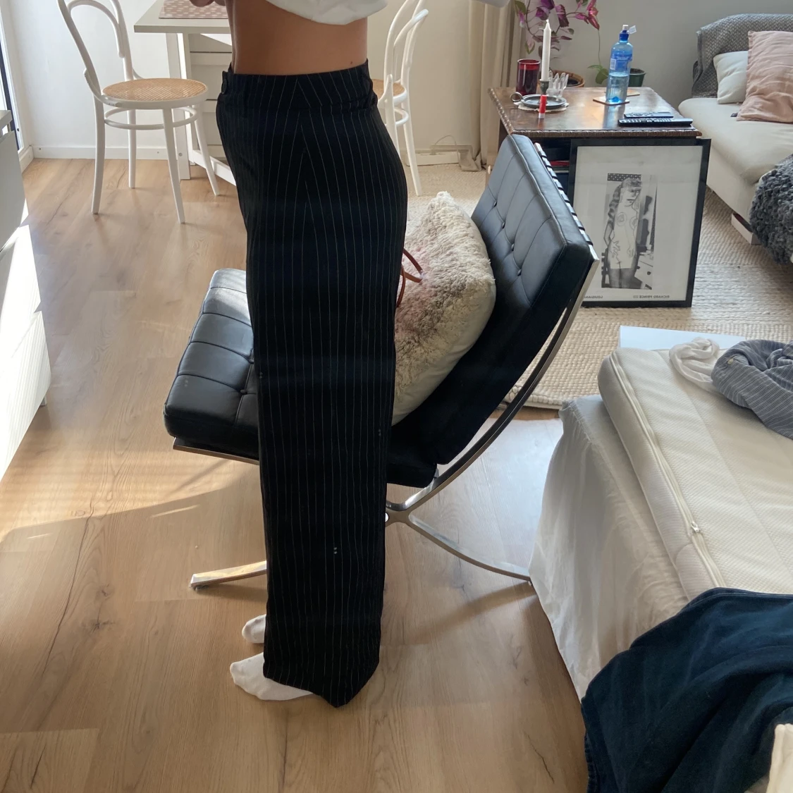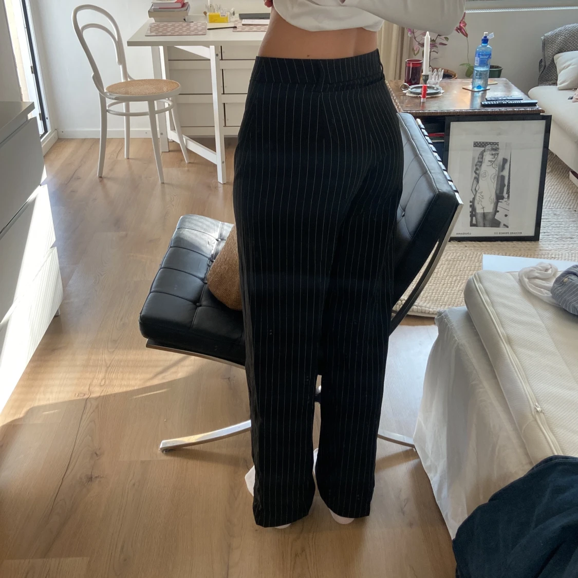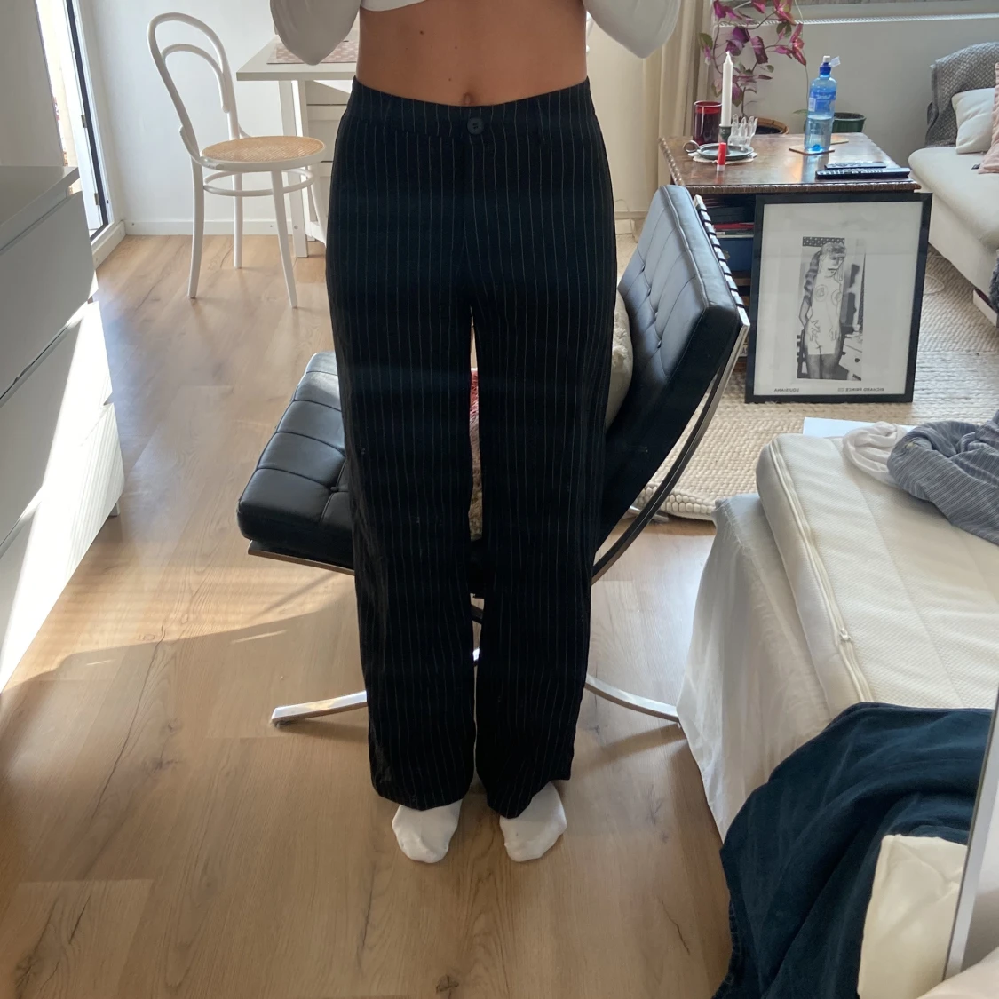 Svarta kostymbyxor byxor med små vita ränder från bershka. Mid waist i storlek 38. För referens, jag är 176cm och mitt midjemått där byxorna slutar är ca 77cm. Lappen är borttagen men byxorna är aldrig använda.