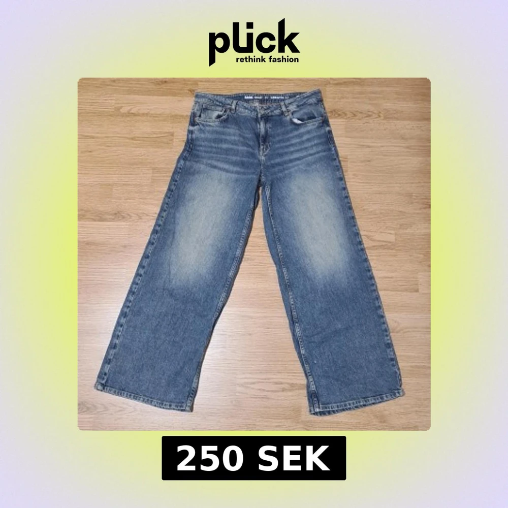 Ett par blå jeans från Never Denim köpta på BikBok, säljes på grund av att de inte passar mig längre. Till modellen är de vida i benen med ganska låg midja och i ett hyfsat stretchigt material. Använda väldigt varsamt och sparsamt och därför i nyskick. OBS: jeansen har en tvätt som ger de en gul ton, det är meningen att de ska se ut så. Midjemått: 41,5 cm. Innerbensmått: 76 cm. Skriv gärna till mig om det uppstår frågor!