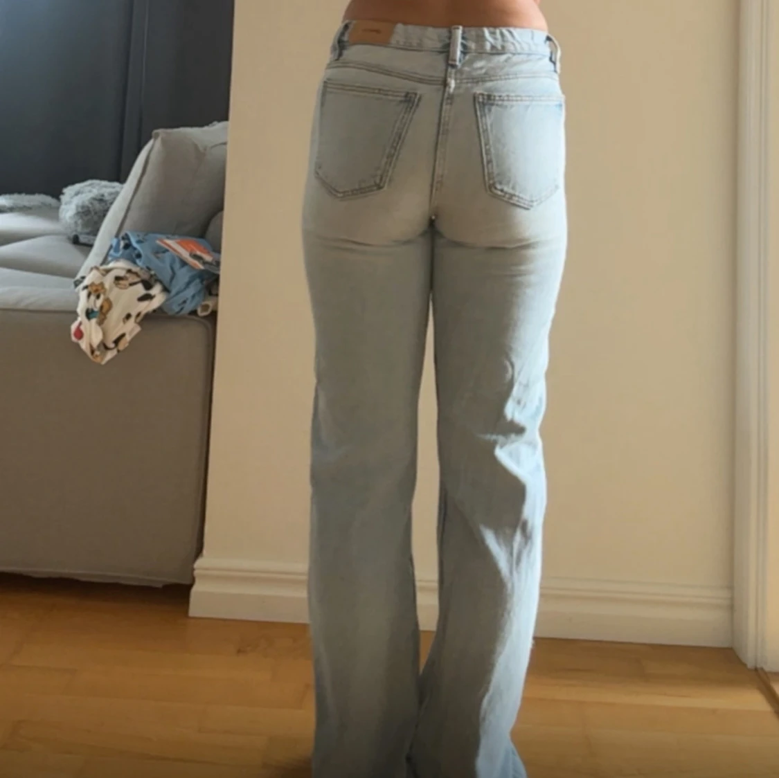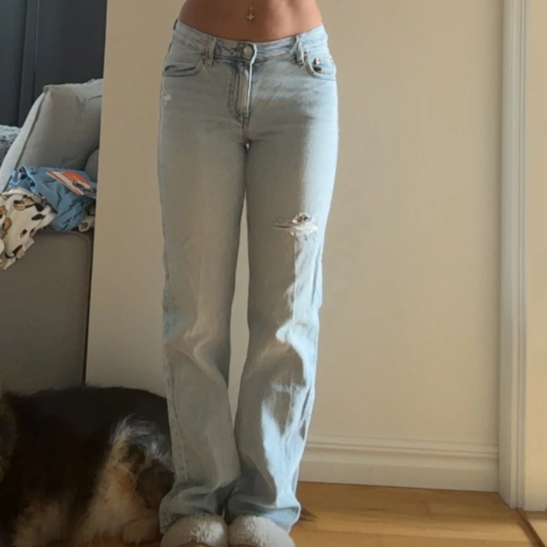 Säljer ett par ljusblå straightleg jeans med slitning på ena låret. Jeansen har mid waist, klassiska fem fickor och dragkedja med knapp. Perfekta för dig som gillar en avslappnad men trendig look.