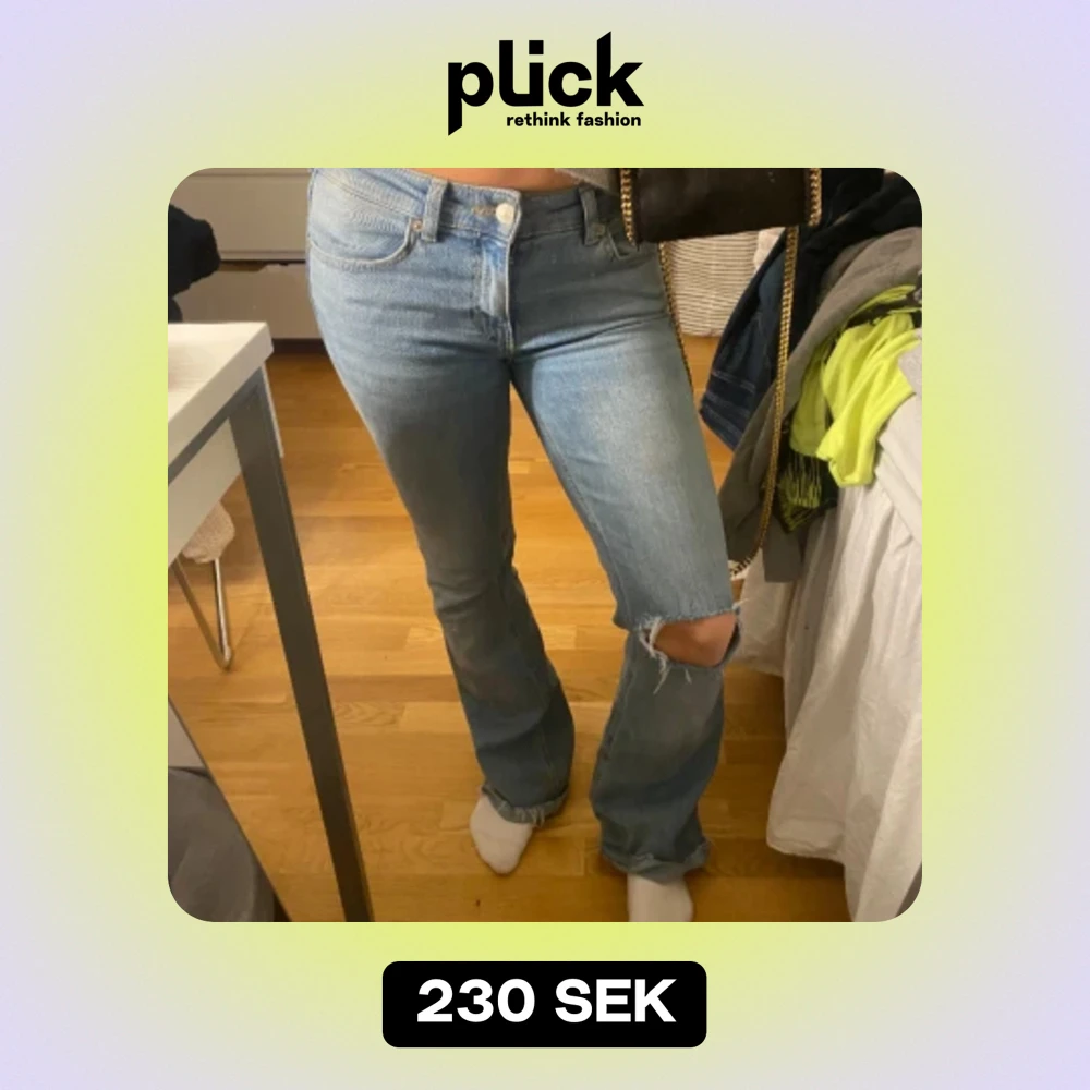Säljer dom här jätte söta jeansen med ett hål! Dom sitter perfekt och är som nya💖 har gjort hålet själv! Dom är mid wasit typ💝skriv för fler frågor och bilder!