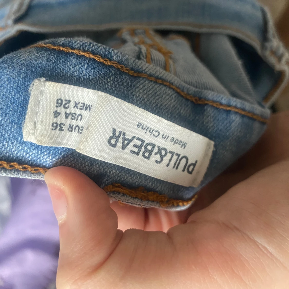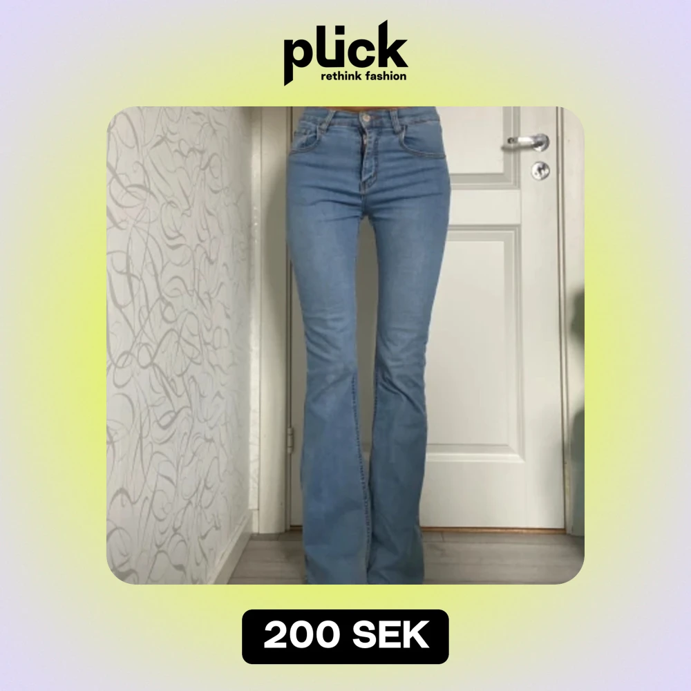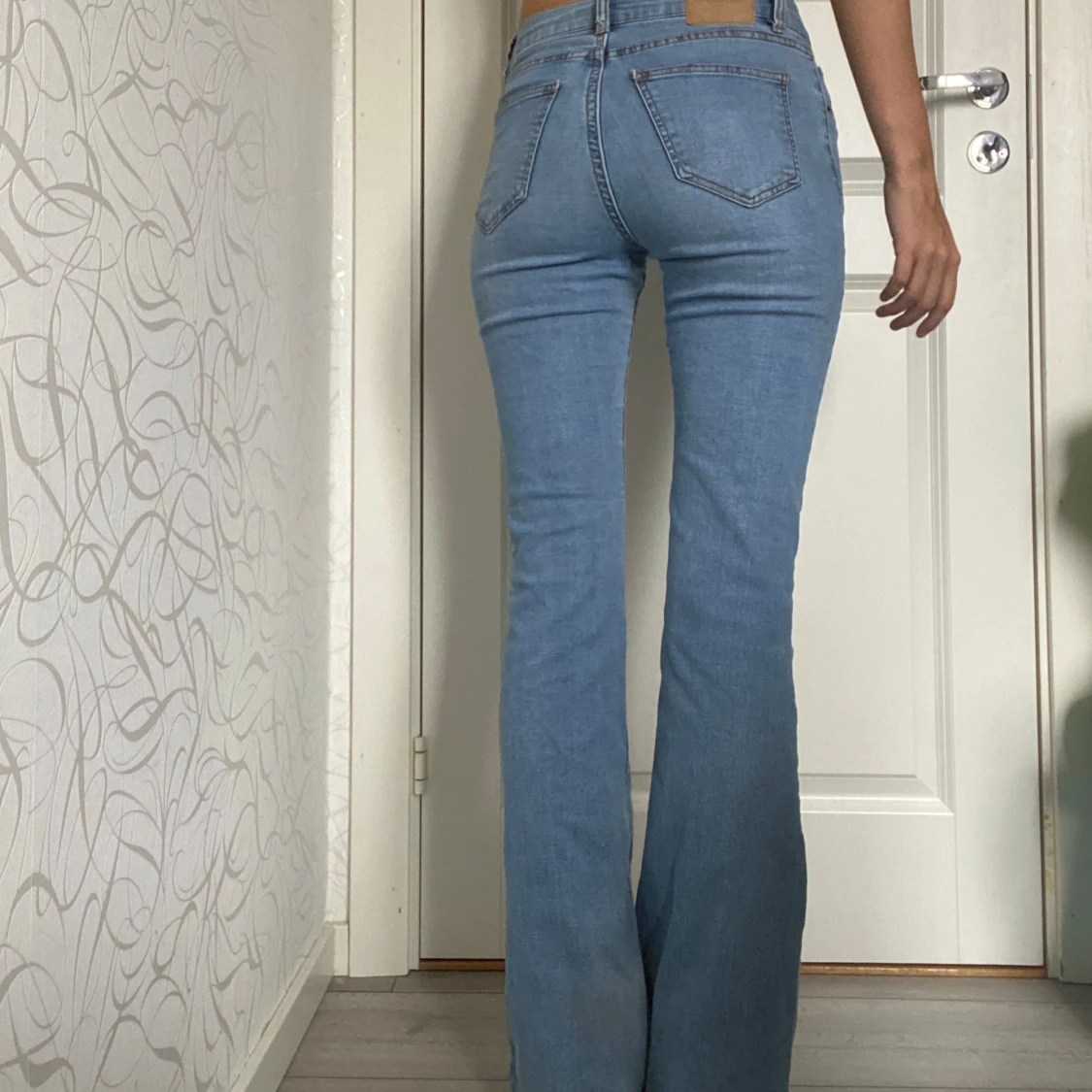 Säljer ett par snygga blå bootcut jeans. De är mellan midjade och har en klassisk femficksdesign med dragkedja och knapp framtill. Perfekta för både vardag och fest!