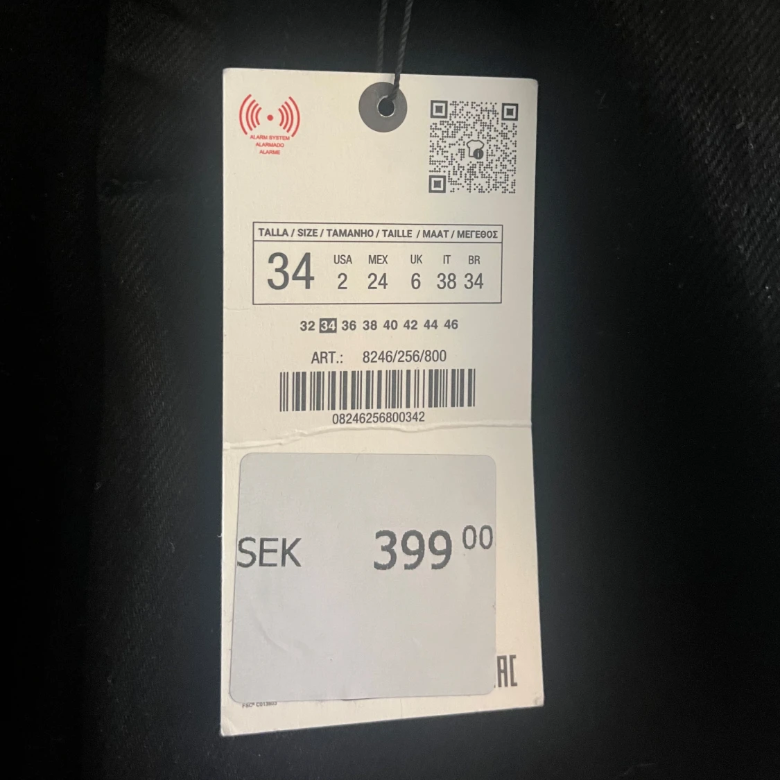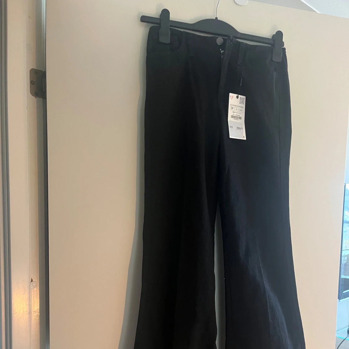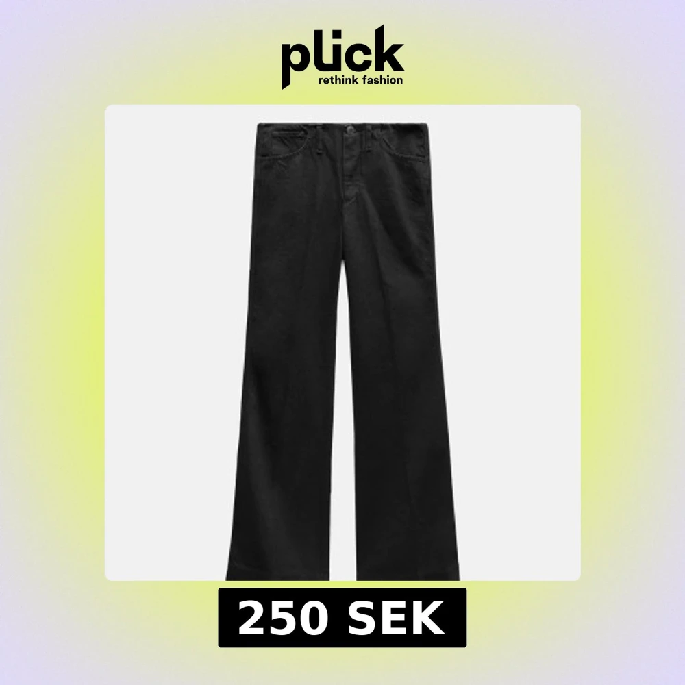 Säljer ett par svarta byxor från Zara med vid passform och klassisk femficksdesign. Byxorna har medelhög/låg midja och raka, vida ben som ger en trendig siluett. Aldrig använda med lapp kvar🖤