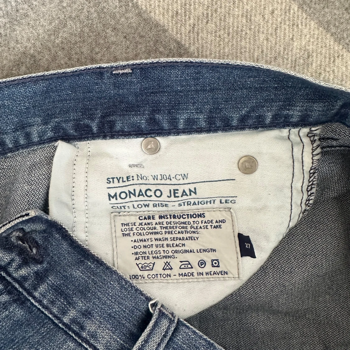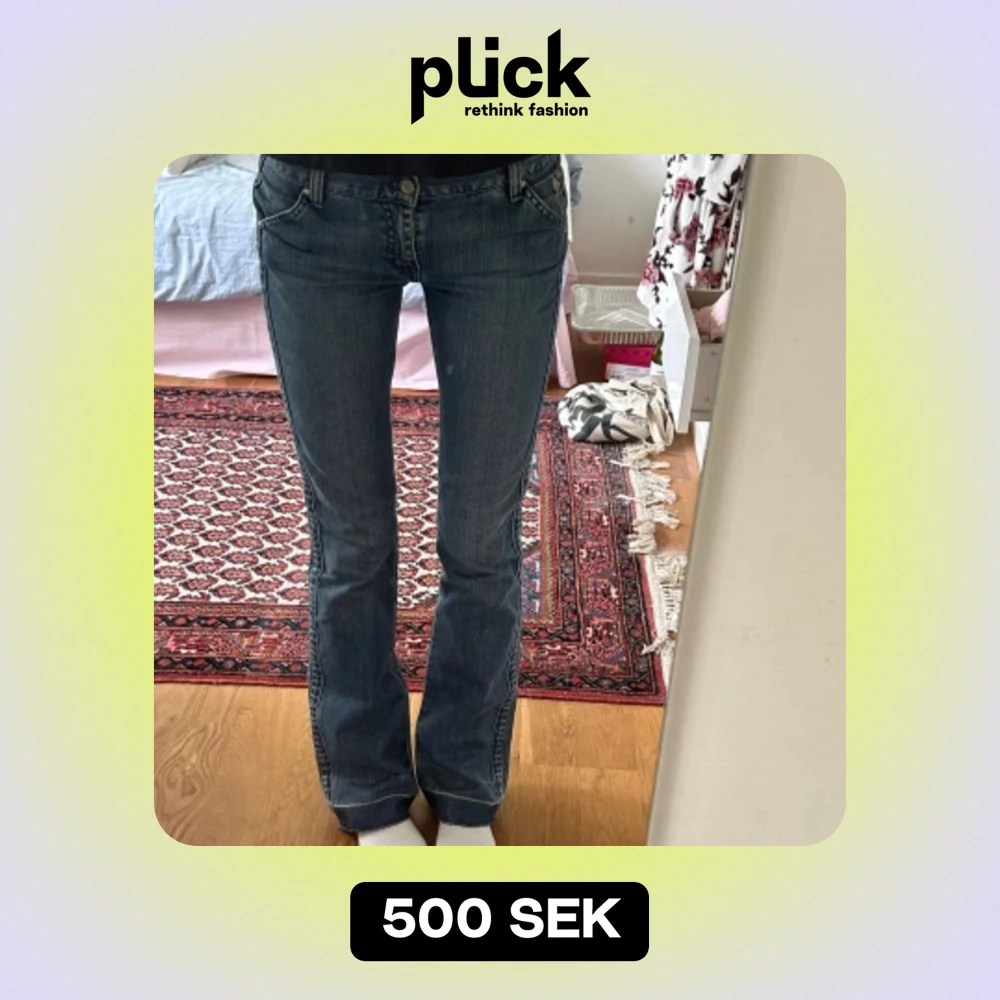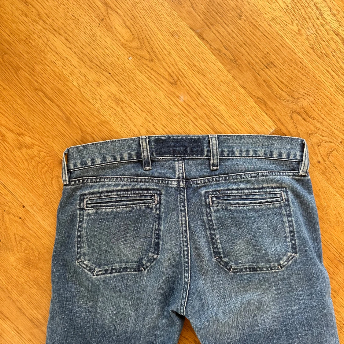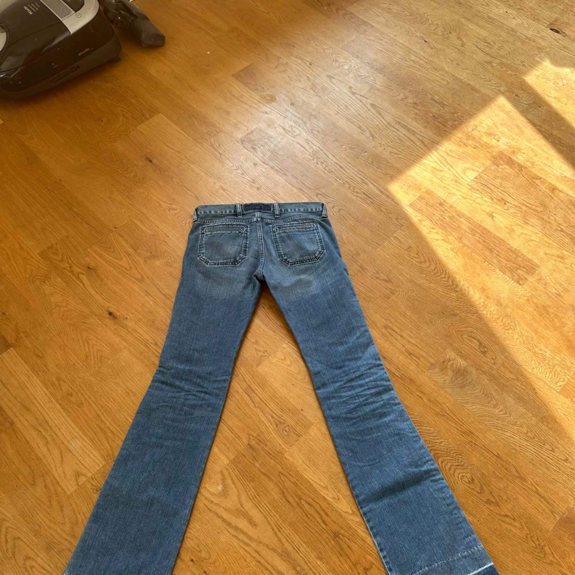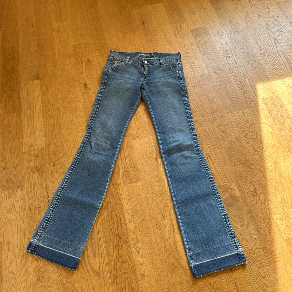 Lågmidjade utsvängda jeans från Made in Heaven. Sprättat upp dom nertill, annars som nya! Innerbenslängd 88cm, midja 82cm. Kan posta eller mötas upp i Stockholm 🌸🌸