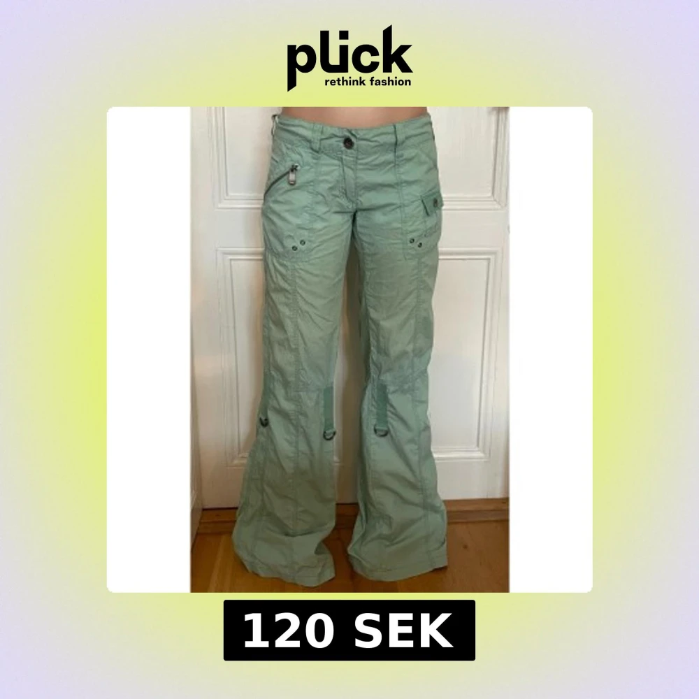 Snygga mintgröna cargopants med vida ben och flera fickor fram och bak. Modellen på bilden är 157cm och står på tå. Innerbensmått: 85cm. Midja rakt över: 44cm