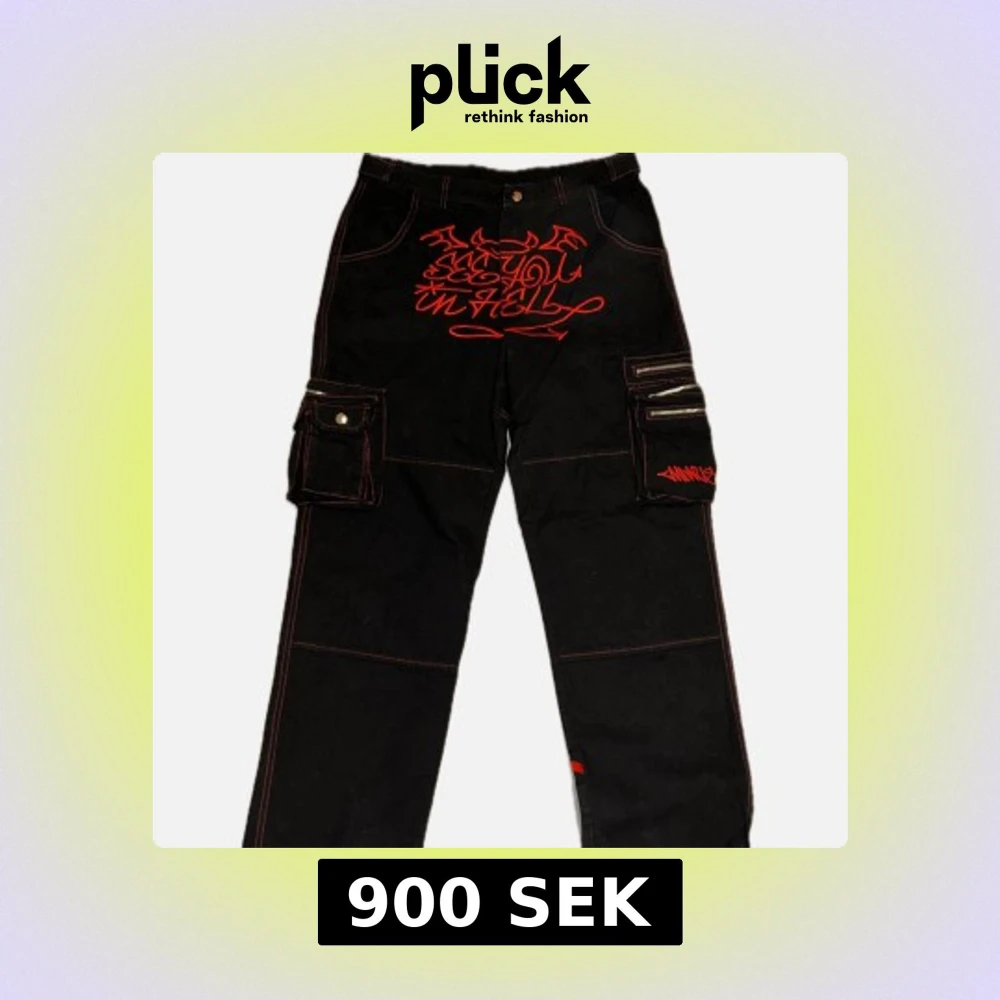 Unika svarta cargobyxor med röda grafiska tryck och illustrationer både fram och bak. Byxorna har stora fickor med dragkedja på sidorna och detaljerade sömmar. Perfekta för dig som vill sticka ut med en edgy streetstyle.