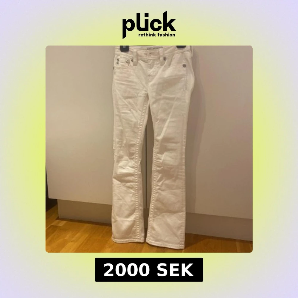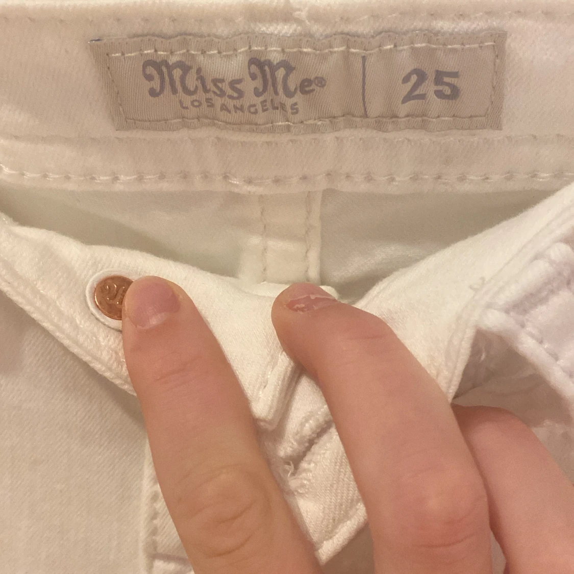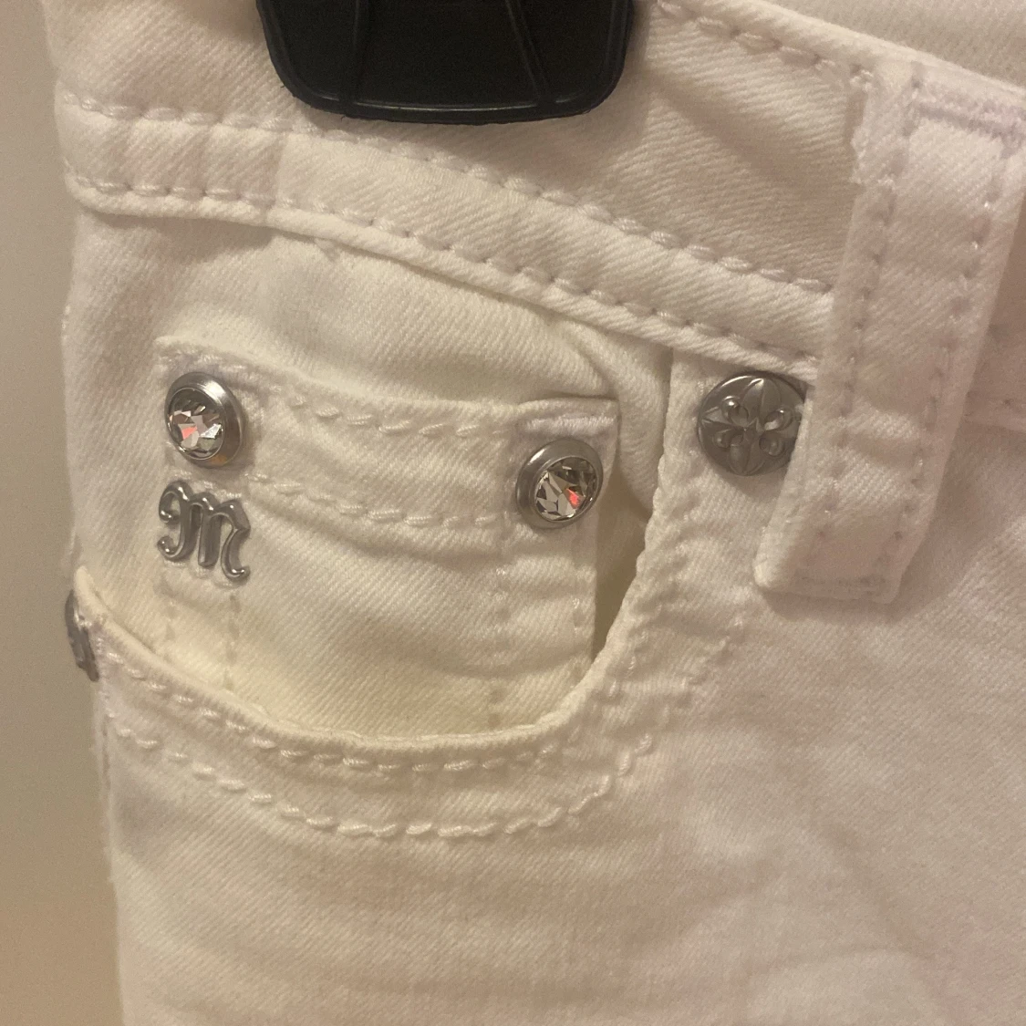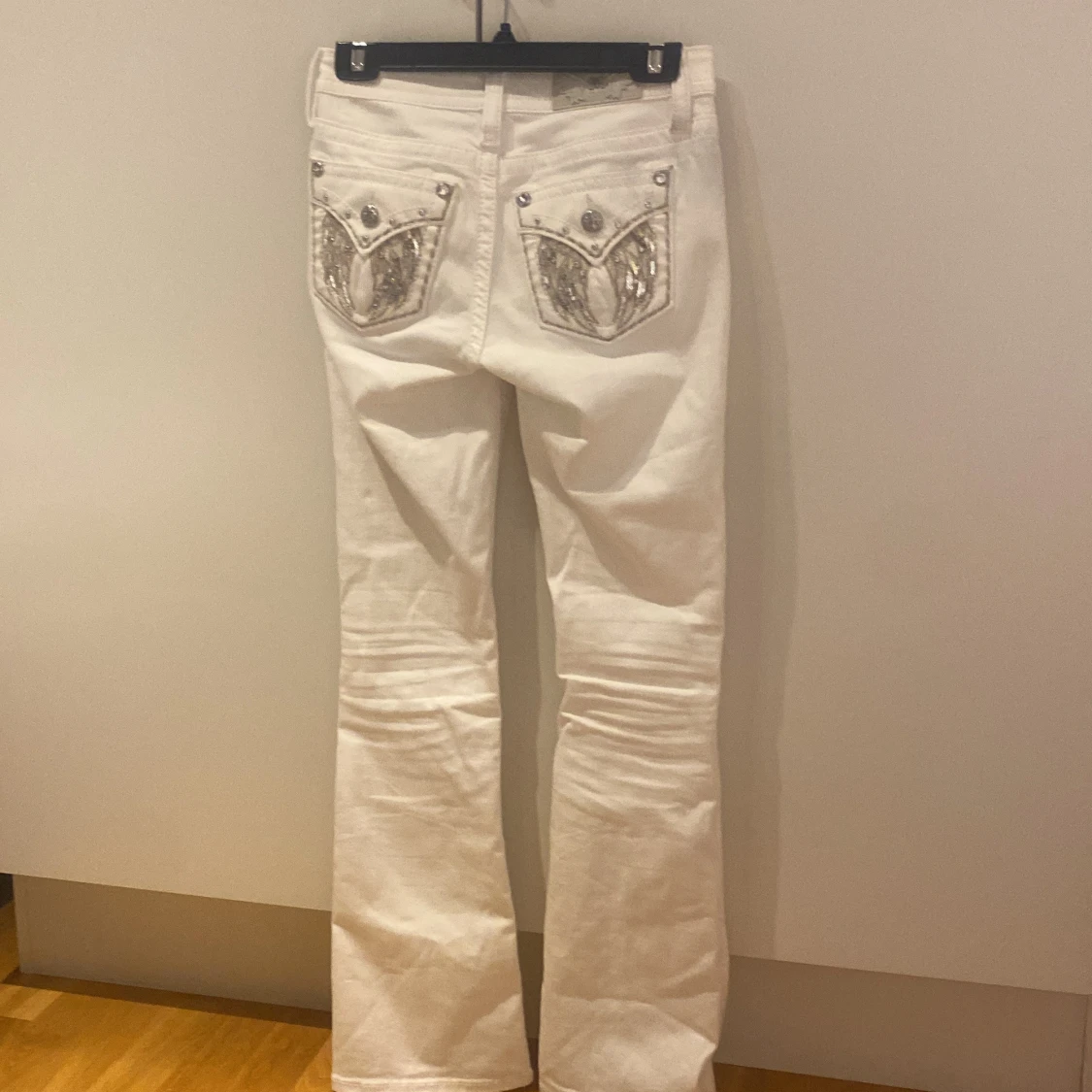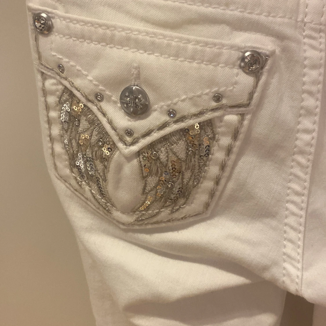 Snygga vita jeans från Miss Me i bootcut-modell. Byxorna har coola bakfickor med paljett- och broderidetaljer i silver och guld. Klassisk femficksdesign och silverfärgade nitar. Perfekta för dig som vill sticka ut lite extra.