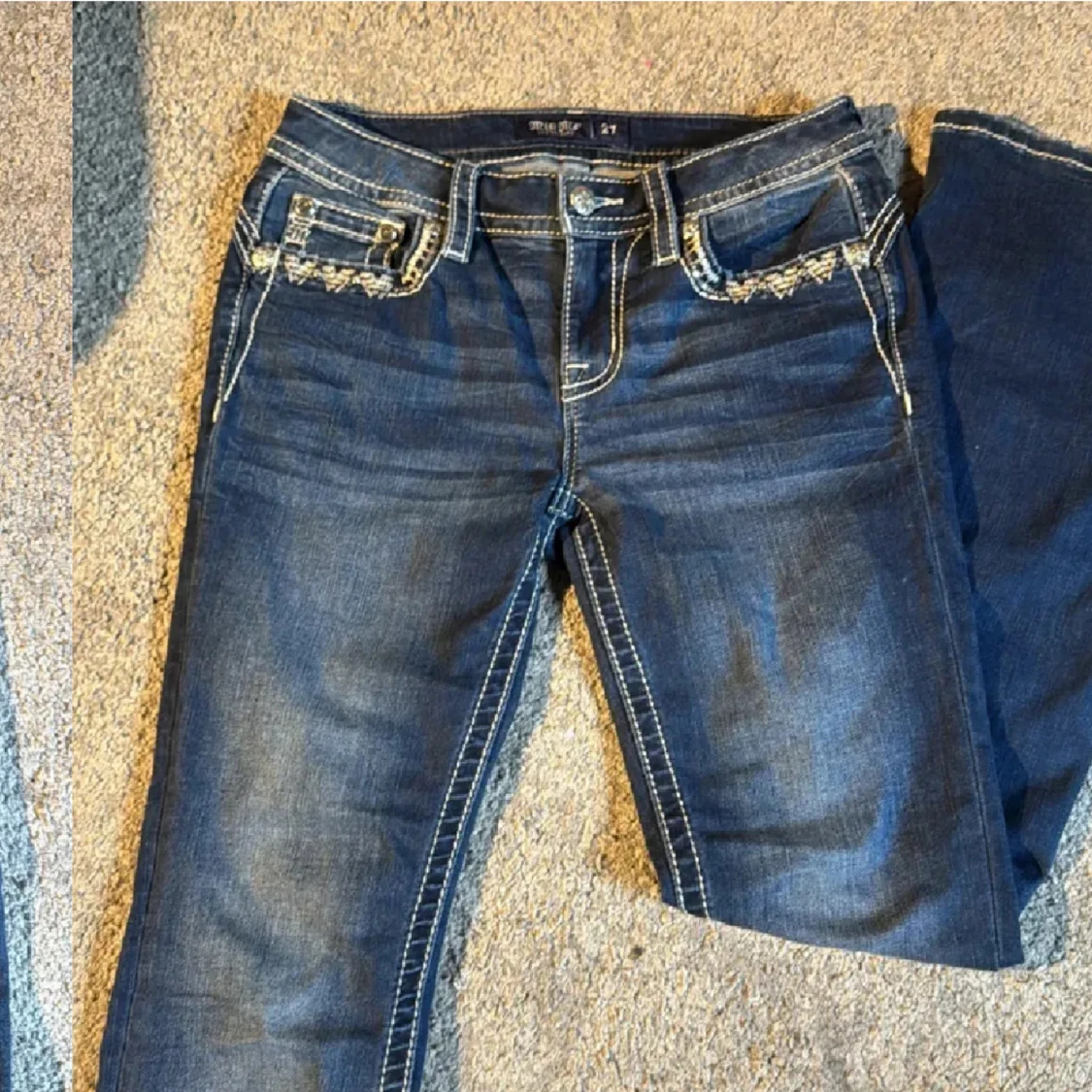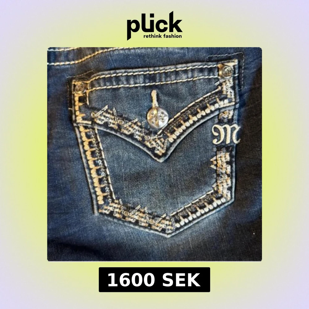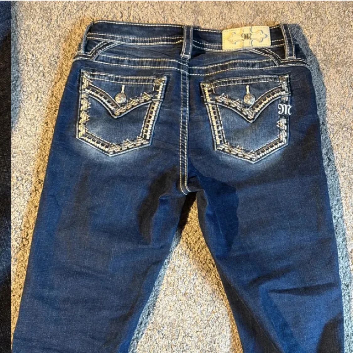 Snygga blå jeans från Miss Me med coola broderade bakfickor, kontrastsömmar och dekorativa knappar. Riktigt bra skick, säljer då de är för stora för mig. Har lappar och kvitto kvar!