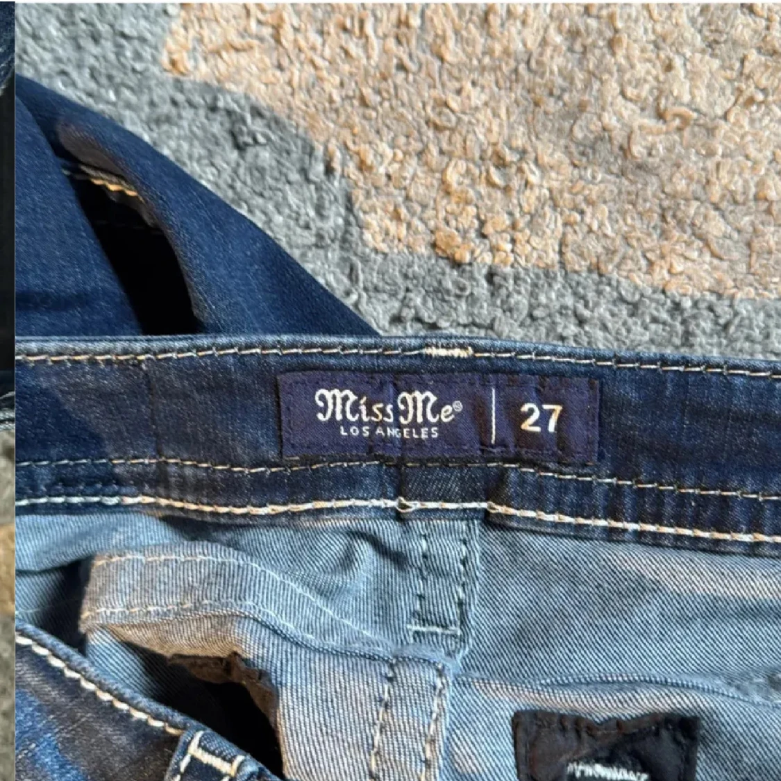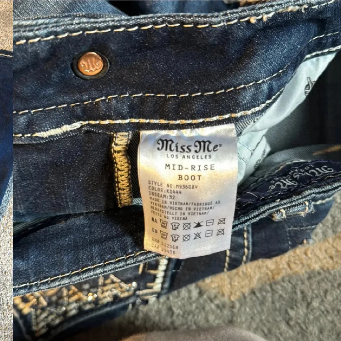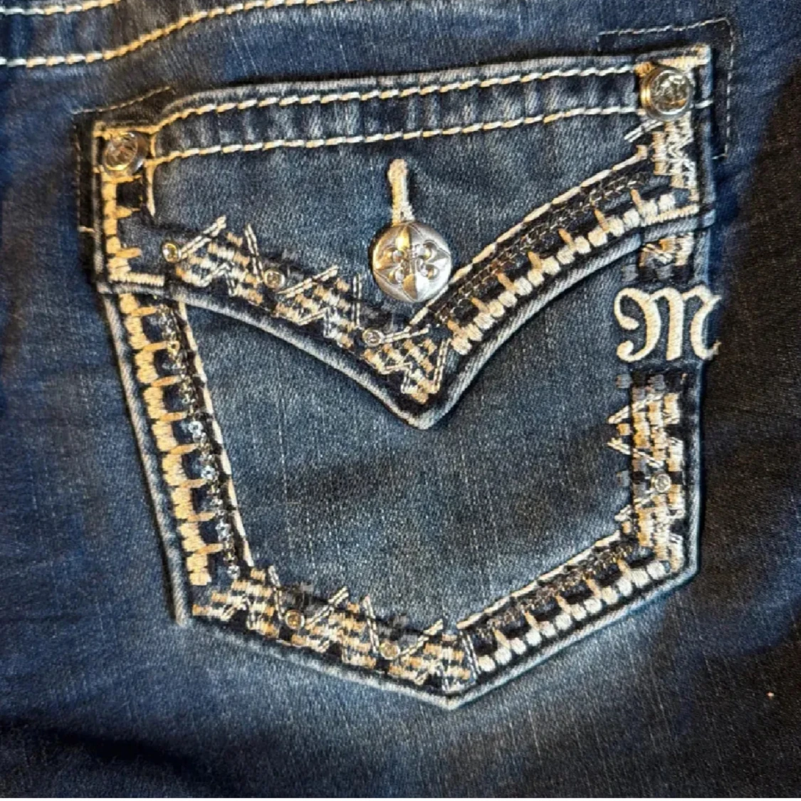 Snygga blå jeans från Miss Me med coola broderade bakfickor, kontrastsömmar och dekorativa knappar. Riktigt bra skick, säljer då de är för stora för mig. Har lappar och kvitto kvar!