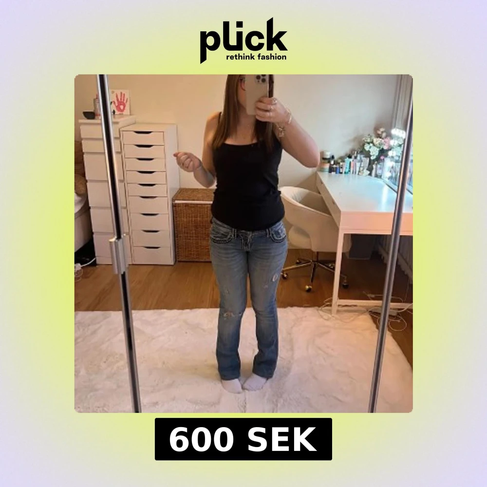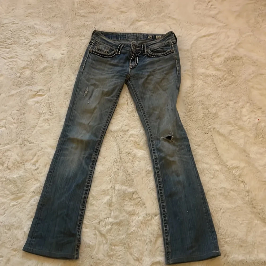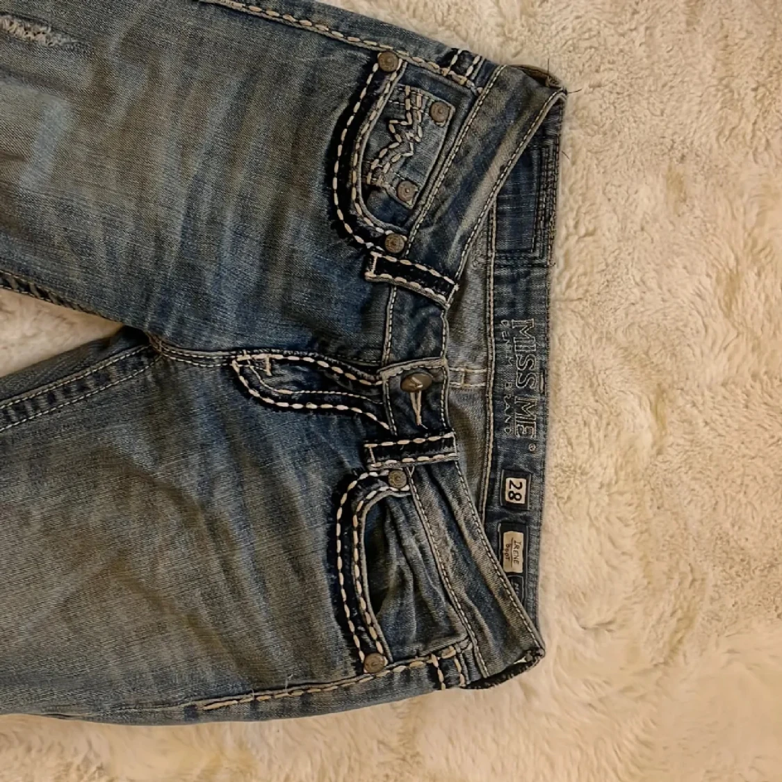 Säljer ett par blå bootcut jeans från Miss Me med snygga kontrastsömmar och broderade bakfickor. Jeansen har låg midja, slitningar och detaljerade ficklock. Perfekt för dig som gillar en unik och cool denimstil. Priset kan absolut sänkas och diskuteras om du är redo att köpa de i stund. Skriv om fler frågor 💕💕De är inte mina bilder de är föra ägarens men är inte använda sen dess då dem aldrig kommer till användning