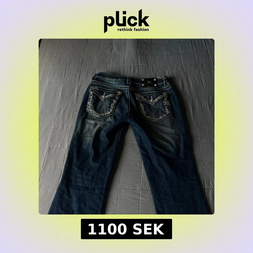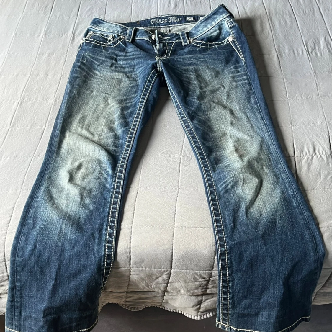 Snygga blå jeans från Miss Me med slitningar och kontrastsömmar. Bakfickorna har detaljerade broderier och nitar, samt en metallogo. Jeansen har bootcut-modell och är tillverkade i klassiskt jeanstyg.